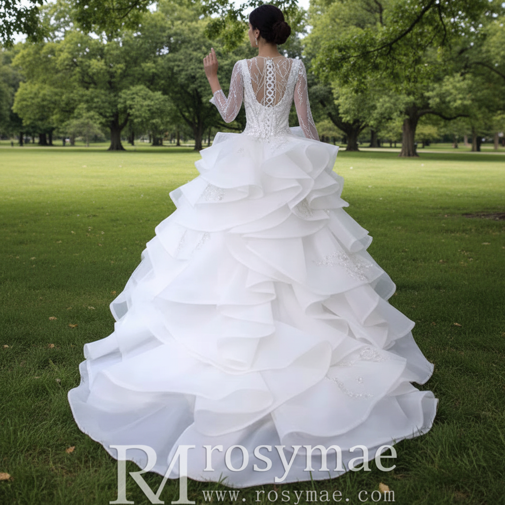 Cette robe de mariée, confectionnée à la main avec un soin exceptionnel, allie avec brio l'élégance classique à un romantisme moderne. Son décolleté en V gracieux se prolonge en de délicates manches longues, réalisées en dentelle transparente ornée de perles fines qui captent la lumière d'un doux éclat. Des volants d'organza superposés créent texture et mouvement, tandis qu'un col montant raffiné et un dos transparent lui confèrent une sophistication intemporelle. Conçue avec une attention méticuleuse aux détails, cette robe vous assure de rayonner de grâce et de confiance le jour de votre mariage de rêve.
