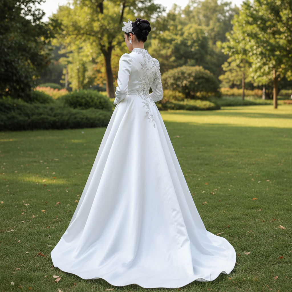 Découvrez l'élégance luxueuse de cette robe de mariée haut de gamme en satin à col rond. Conçue avec un souci du détail et une touche d'influence arabe et musulmane, cette robe présente un magnifique col montant orné de perles et de broderies scintillantes. Réalisée à la main avec un savoir-faire exceptionnel, cette robe est un véritable chef-d'œuvre.