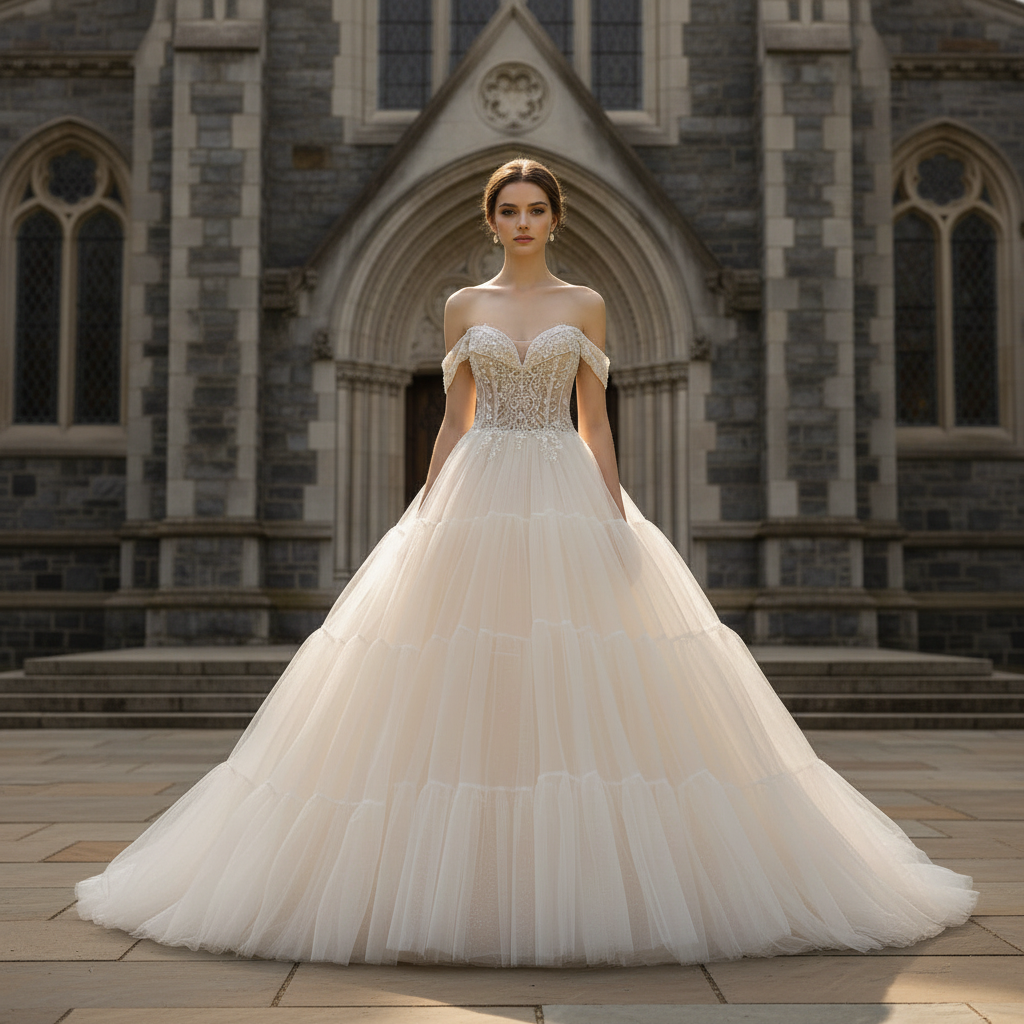 Cette robe de mariée de style bal, à épaules dénudées, présente un décolleté en cœur et un corsage transparent, ajoutant une touche d'éclat à votre grand jour. La jupe bouffante et le tulle scintillant lui confèrent une allure romantique et élégante, vous assurant une beauté rayonnante et une confiance absolue pour cette journée si spéciale.