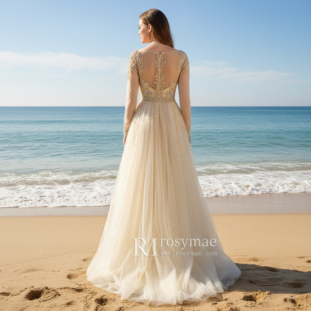 Cette élégante robe de mère de la mariée allie une sophistication intemporelle à des détails raffinés, pensés pour la femme moderne. Son décolleté en V discret flatte toutes les silhouettes avec grâce et sobriété, tandis que ses manches illusion longues offrent une grande liberté de mouvement. Des cristaux brodés à la main ornent l'encolure et l'ourlet, créant un effet lumineux qui capte la lumière avec élégance tout au long de la soirée. Le panneau transparent dans le dos apporte une touche d'élégance inattendue, et sa fermeture éclair discrète facilite l'enfilage. Une traîne fluide et élégante complète la silhouette avec une touche de théâtralité subtile. Conçue pour les mères qui recherchent une allure raffinée et sobre sans renoncer au glamour, cette robe vous garantit confiance et éclat pour célébrer le jour J de votre enfant.