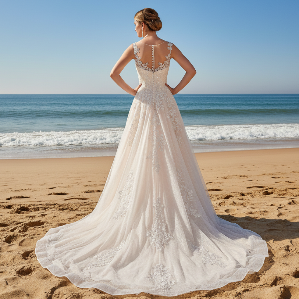 Sublimez votre vision de la mariée avec cette robe de mariée trapèze d'une confection exquise, conçue pour capturer une élégance intemporelle et une sophistication moderne. Le décolleté illusion transparent et le dos nu créent une silhouette romantique qui flatte la silhouette tout en préservant une grâce raffinée. Des appliqués de dentelle florale, réalisés à la main et ornés de perles délicates, se déploient en cascade sur un tulle luxueux, ajoutant dimension et éclat sans alourdir la création. Le corsage structuré présente un dos haut avec des fermetures discrètes par boutons et zip pour un confort optimal tout au long de votre célébration. Une traîne cathédrale majestueuse complète la tenue, offrant une présence spectaculaire lorsque vous remontez l'allée. Confectionnée dans des tons champagne, cette robe allie la tradition nuptiale classique à l'art contemporain, ce qui en fait un choix idéal pour la mariée exigeante en quête d'un luxe discret et d'une confection irréprochable.