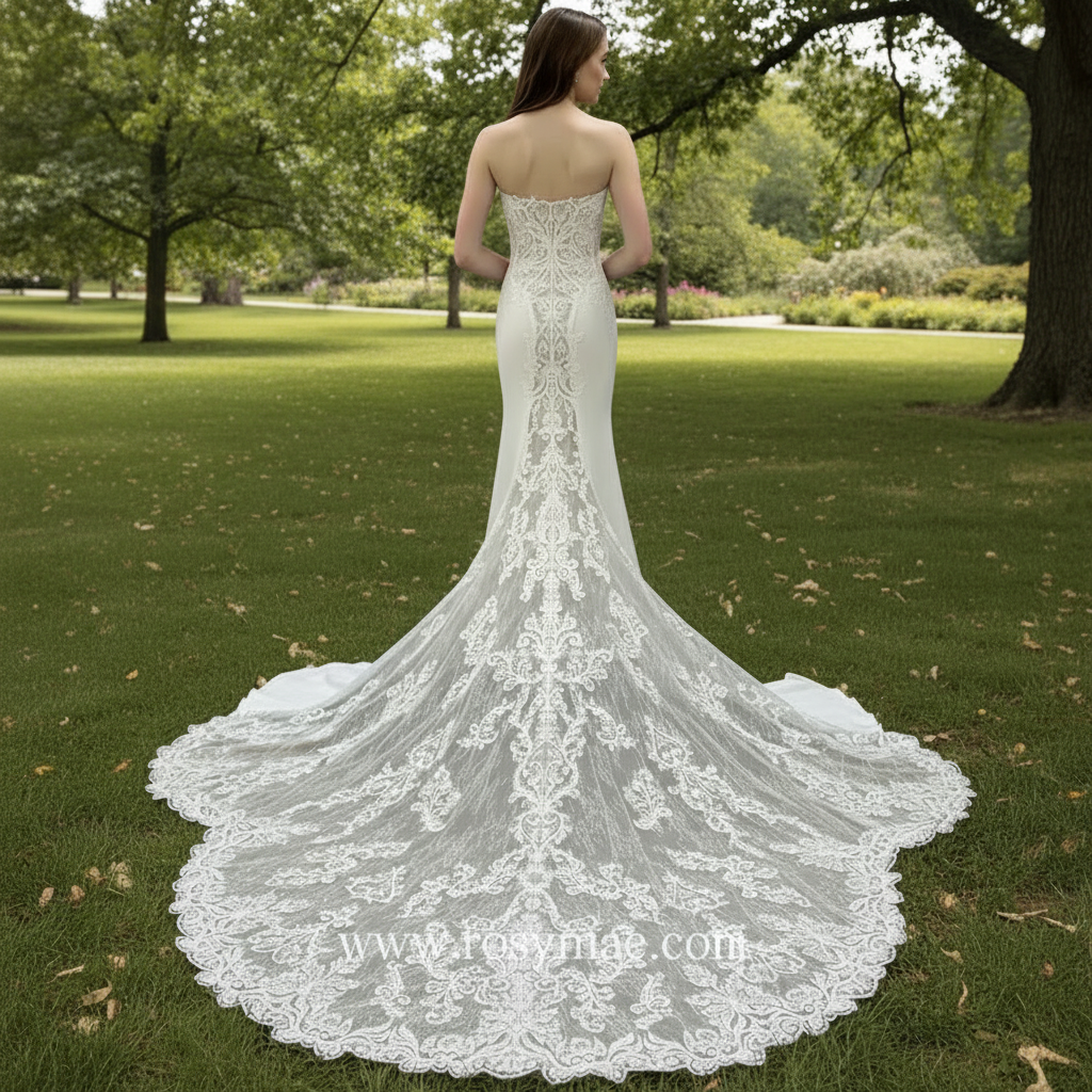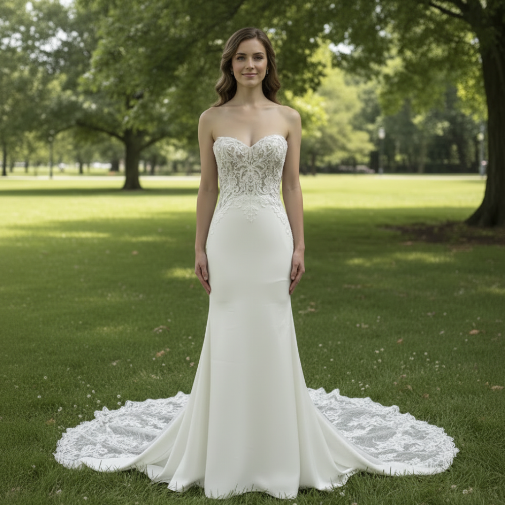 Soyez fabuleuse lors de votre grand jour dans cette superbe robe de mariée sirène sans bretelles avec son dos nu et ses délicats détails illusion. Cette robe intemporelle présente une longue queue de poisson transparente en forme de feuille qui ajoutera du charme à votre look de mariée. Soyez la belle du bal dans ce design classique qui vous fera ressembler et vous sentir comme une déesse.