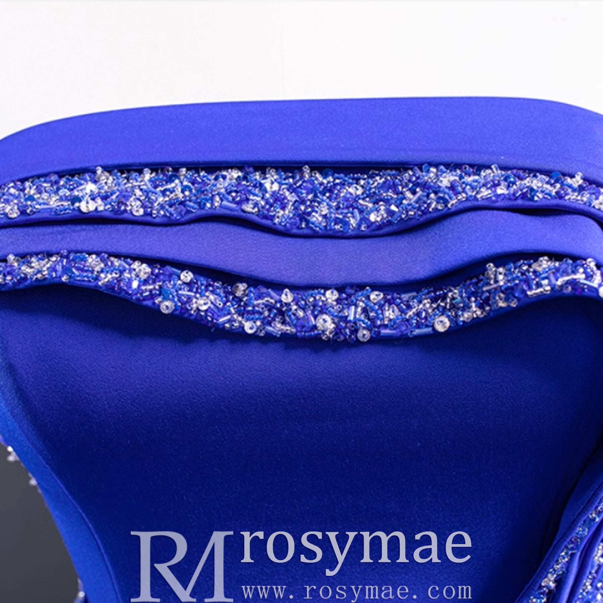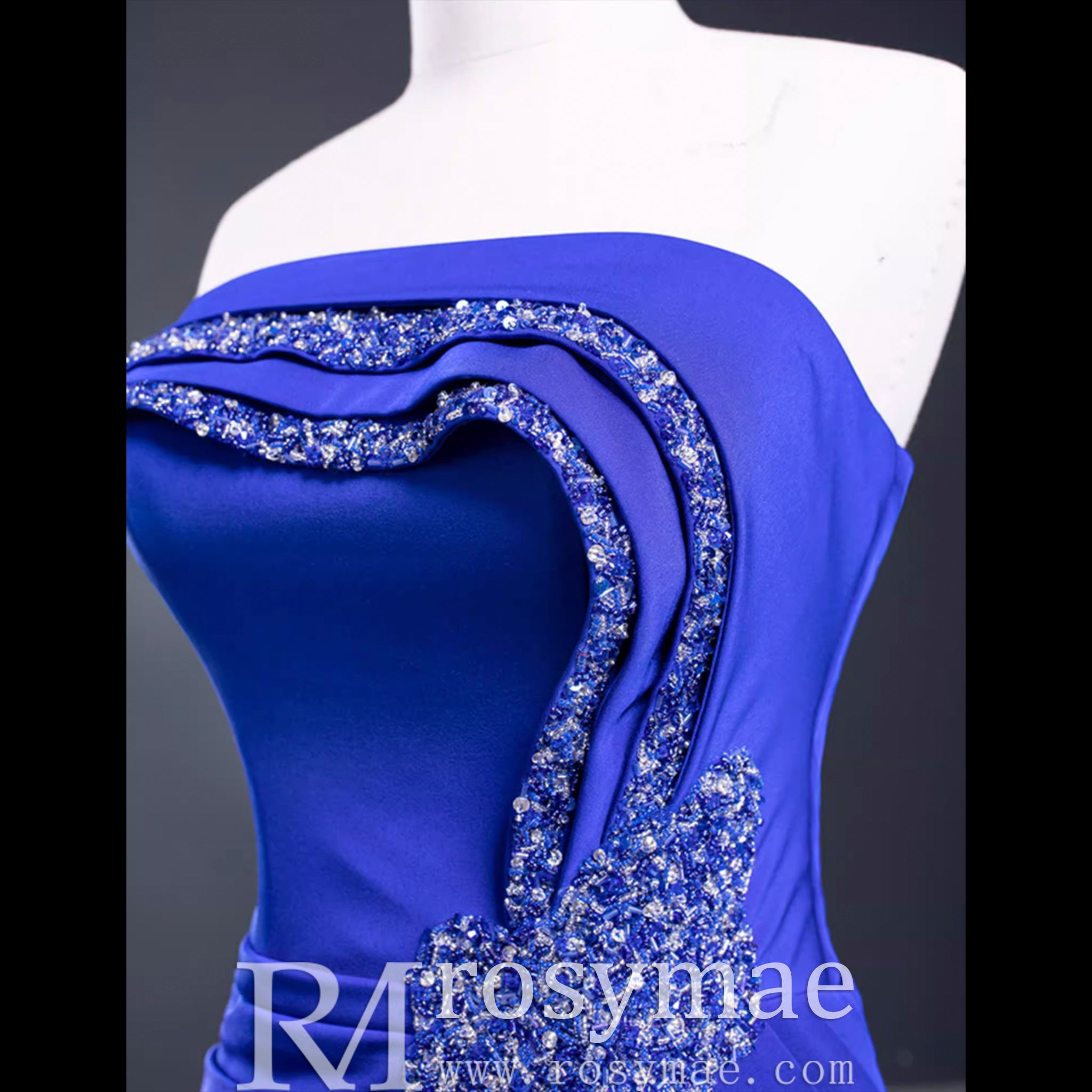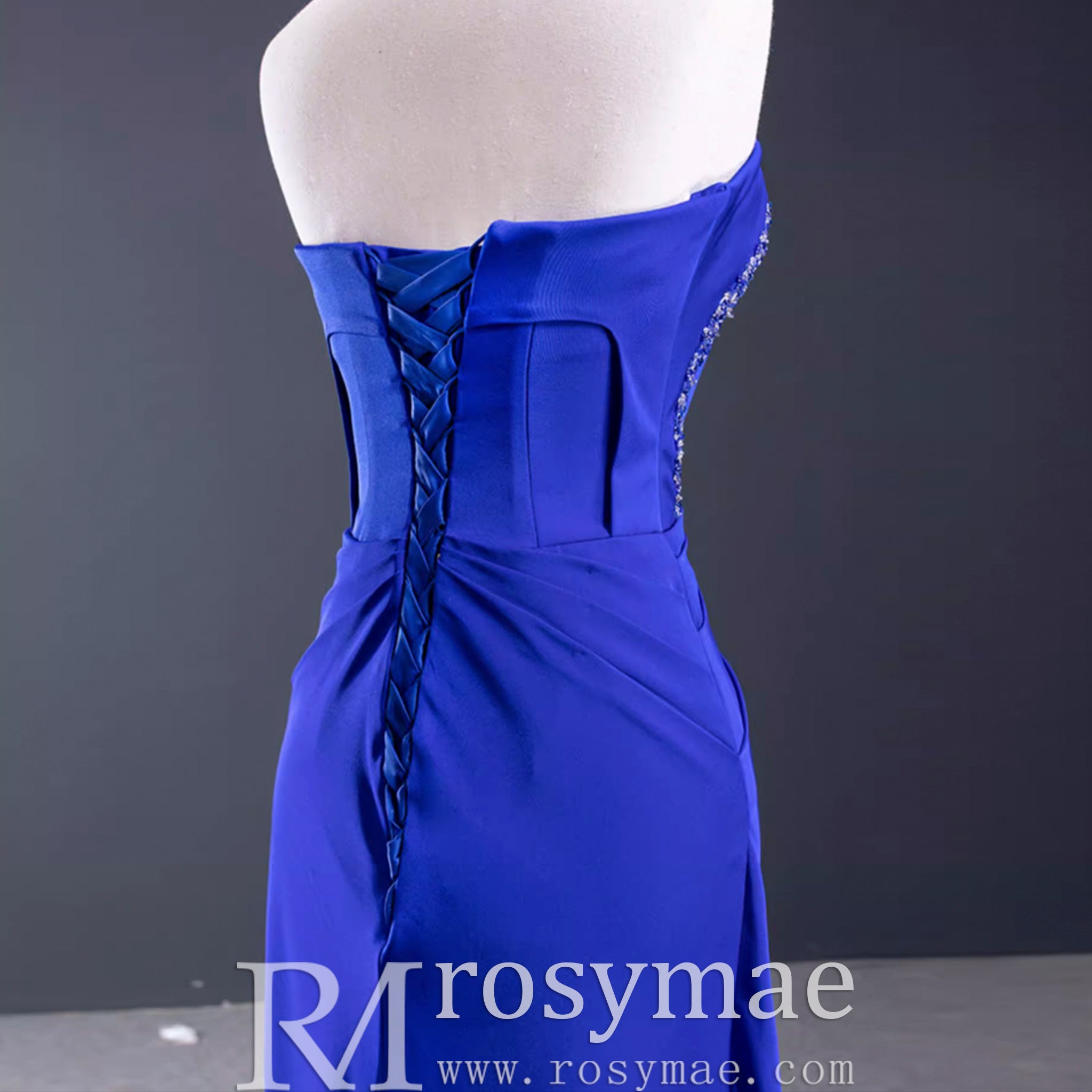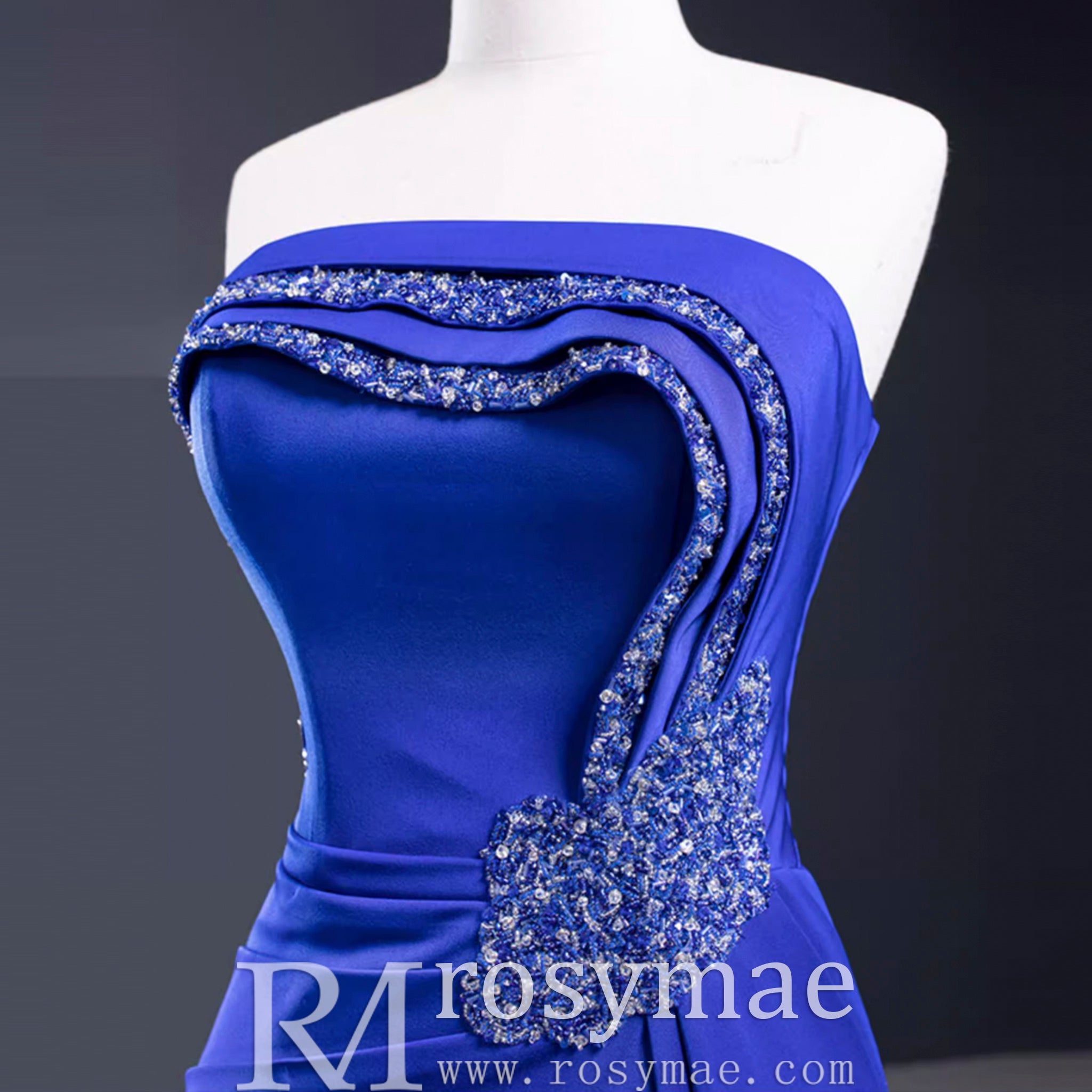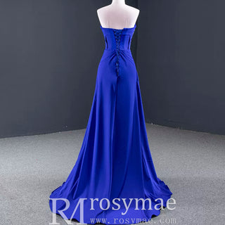 Elevate your style with this A-line luxury prom dress. This gorgeous strapless gown features a low back and stunning royal blue satin fabric. Intricate beading and handmade details add a touch of elegance and create a flattering silhouette. With a leg slit for a touch of drama, this dress is perfect for any special event.