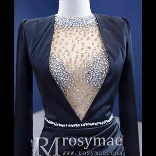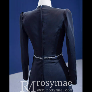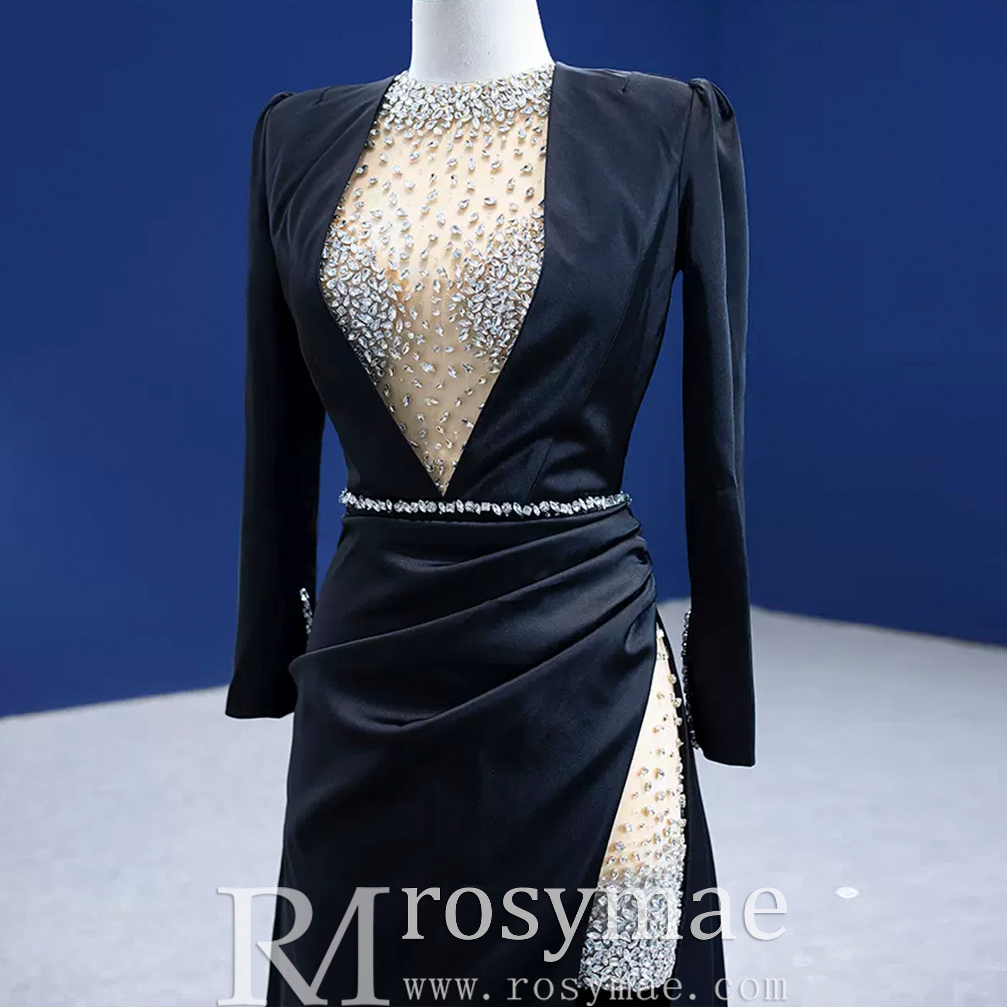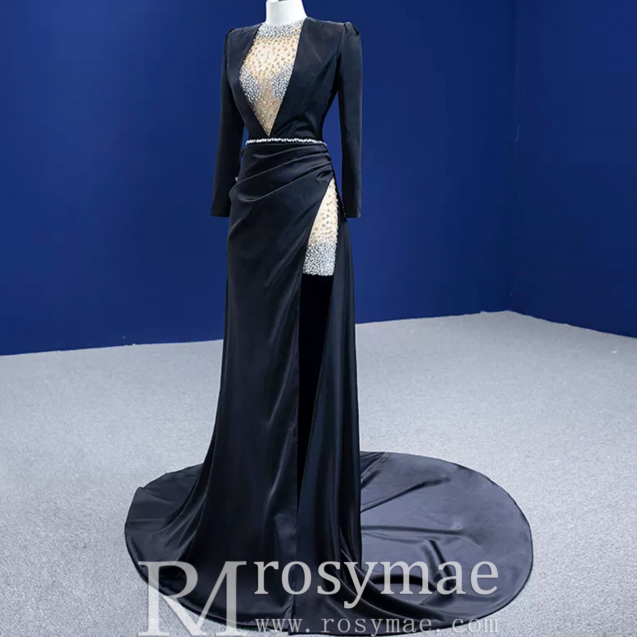 Elevate your formalwear game with this stunning black satin sheath prom dress! Featuring a mock neckline and sheer bodice, this dress is both elegant and charming. The suit design adds a touch of sophistication, while the leg slit adds a hint of drama. Perfect for prom or any special occasion.