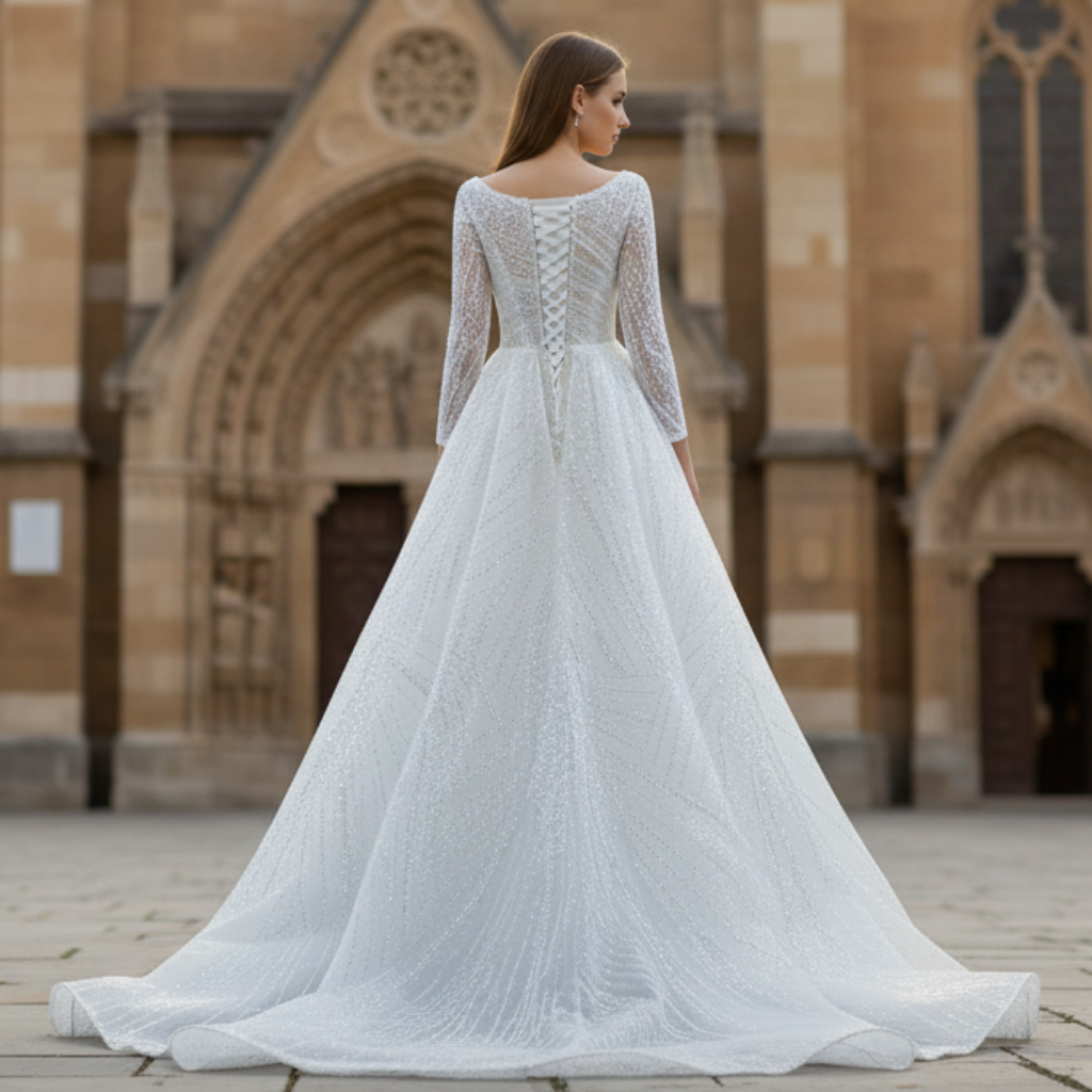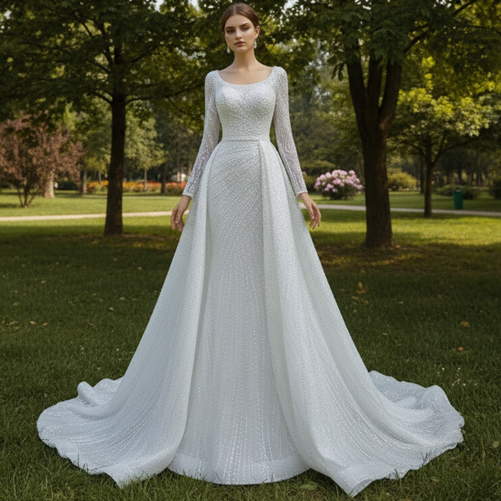 Step into your storybook moment with this exquisite handmade wedding dress, where vintage charm meets modern versatility. The graceful square neckline creates a classic frame for your face and shoulders, while the elegant long sleeves provide sophisticated coverage. Intricate beading cascades across the fitted bodice in delicate patterns, catching the light with every movement to create a mesmerizing sparkle.