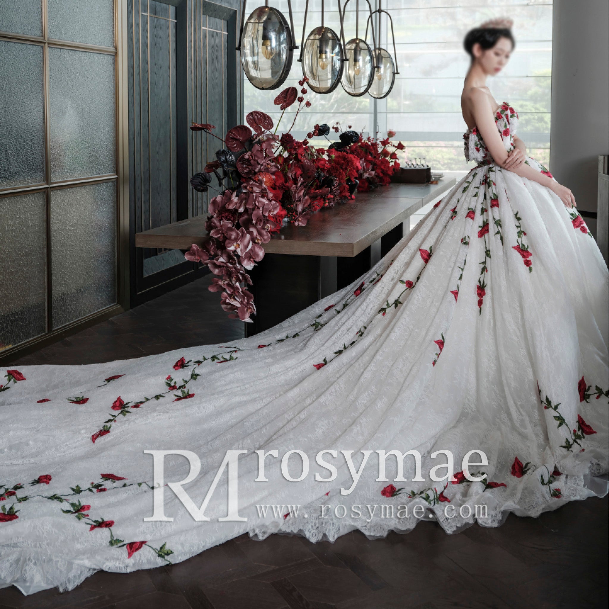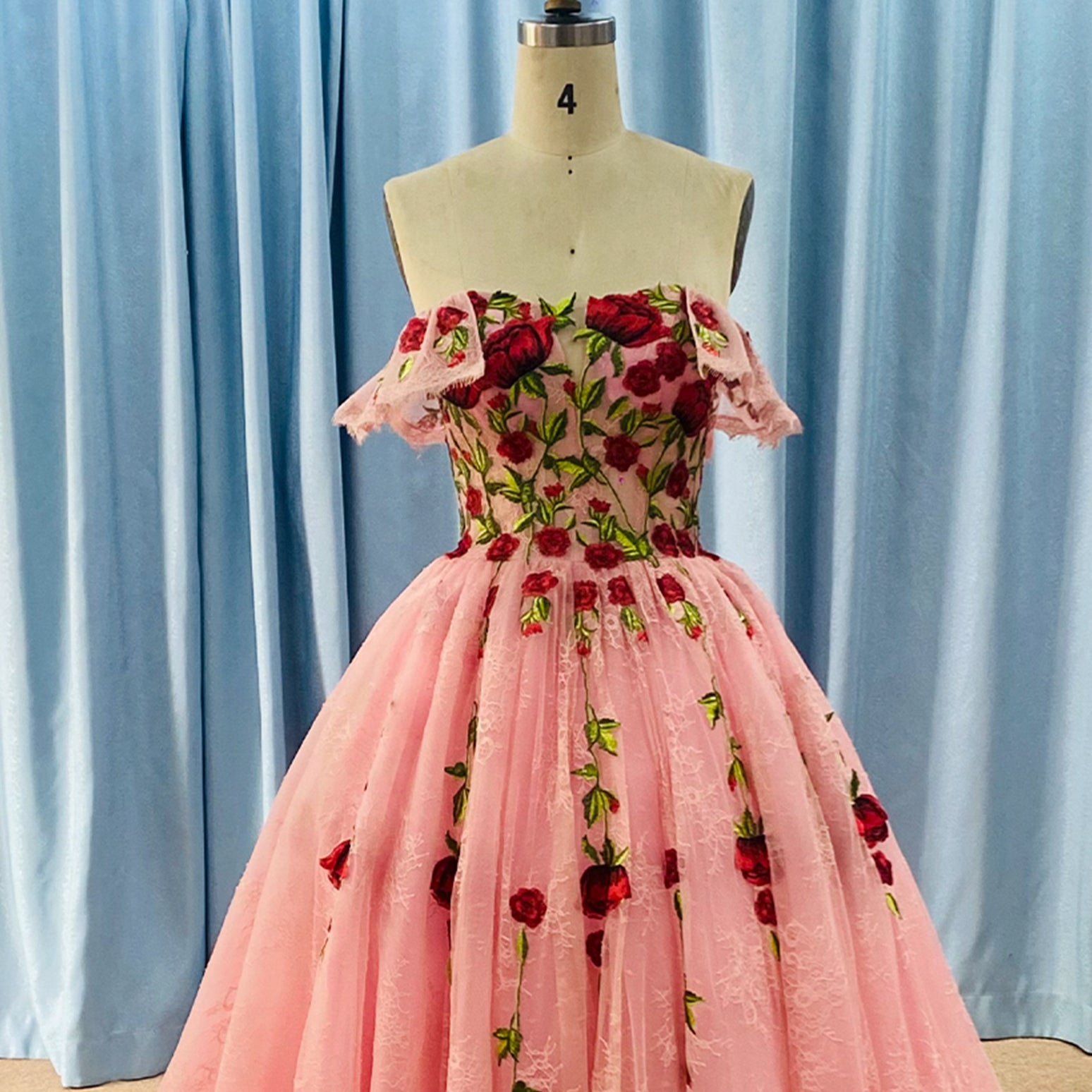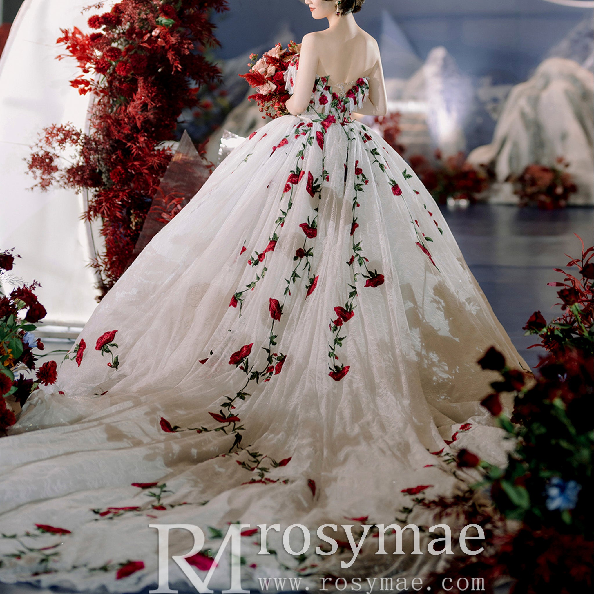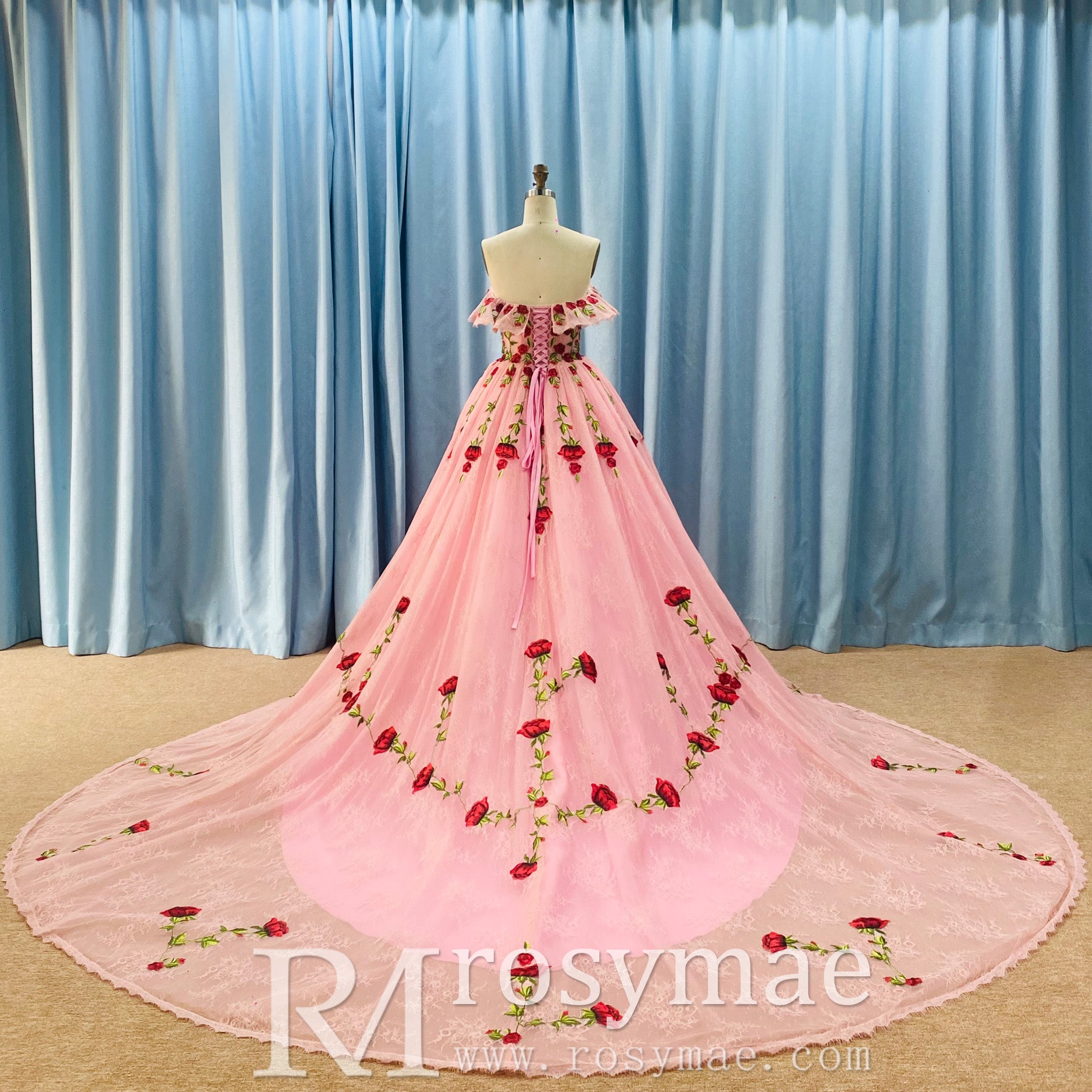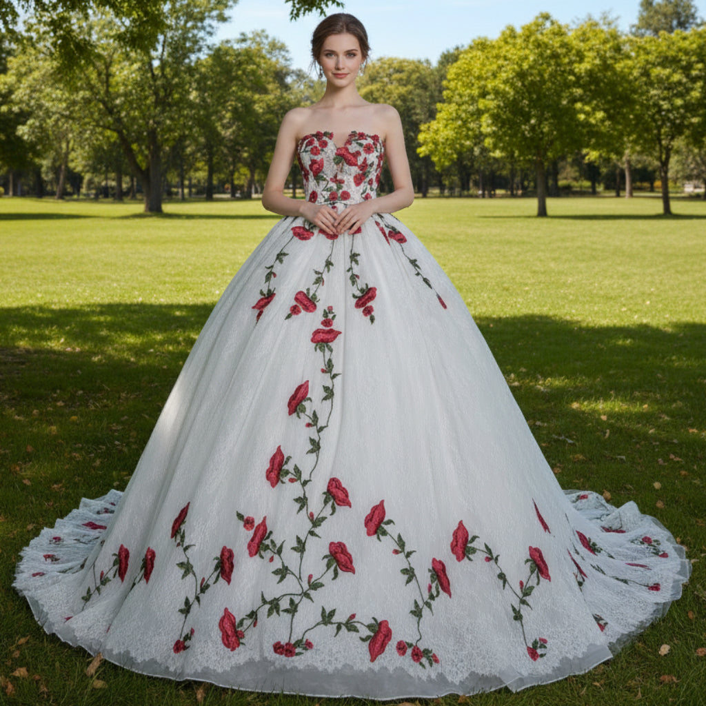 Colourful Embroidery Floral Rose Wedding Dress Quinceanera Party Gown