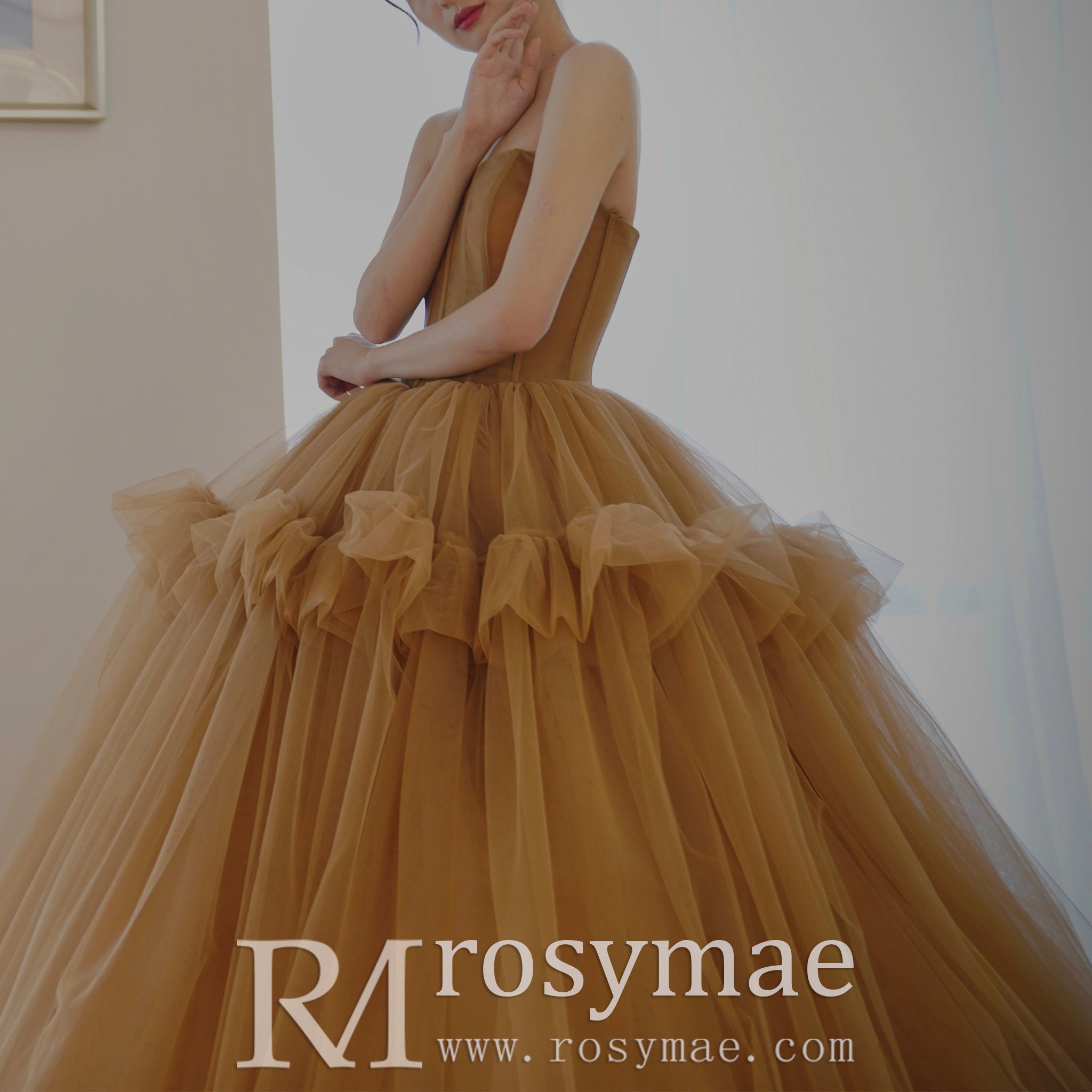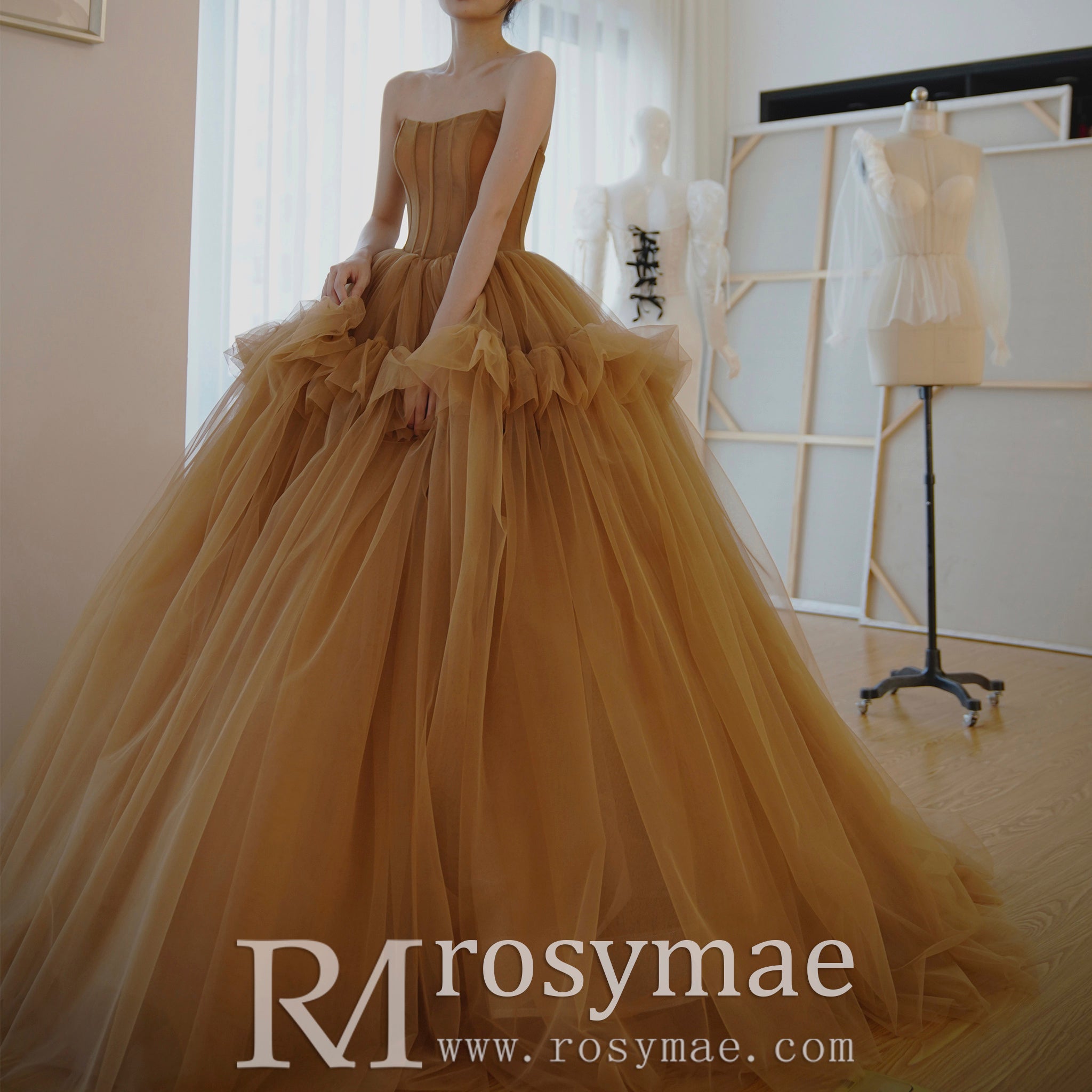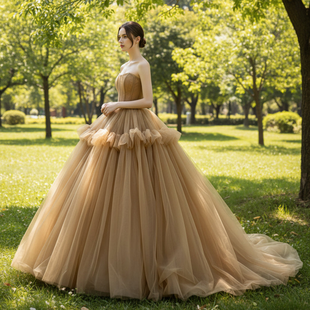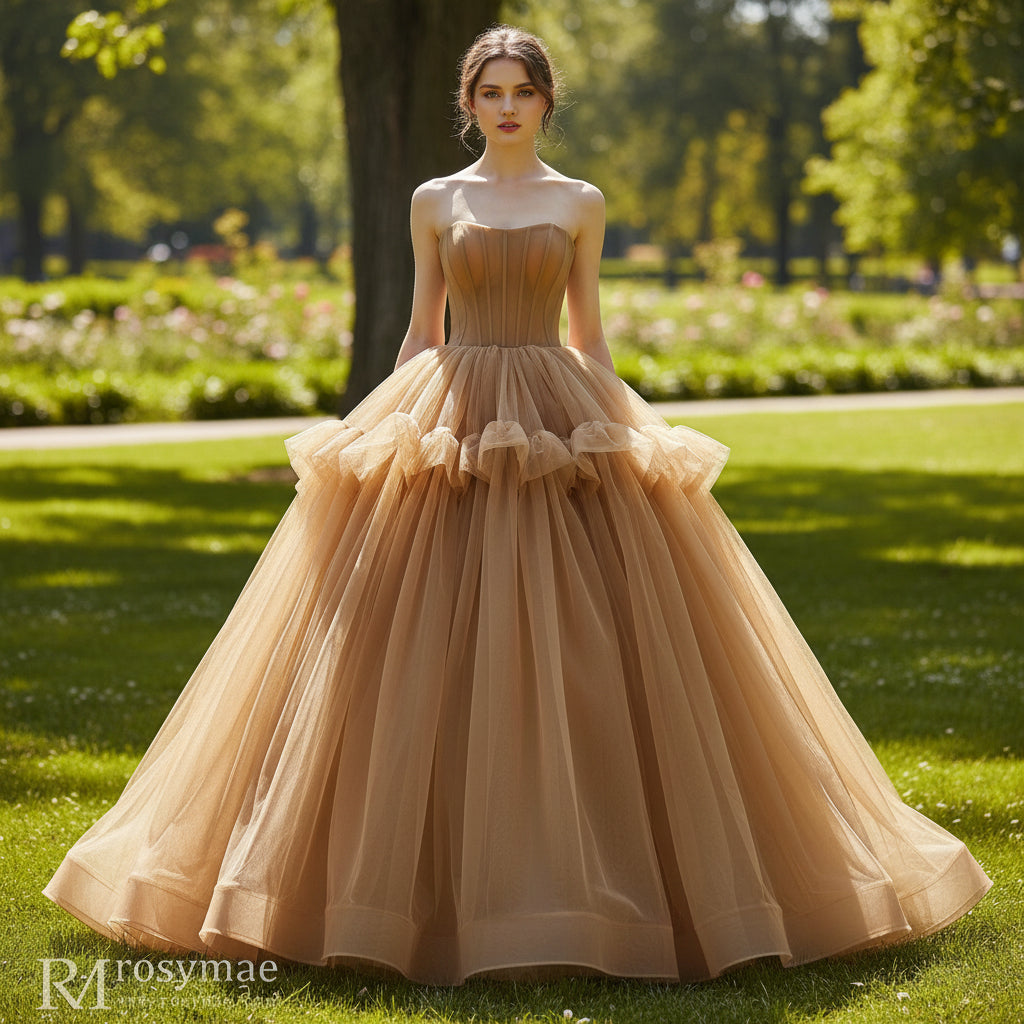 This elegant evening dress features a beautiful sheer bodice paired with an enchanting puffy skirt in deep champagne. Perfect for any formal event, this stunning design will have you looking your best.