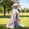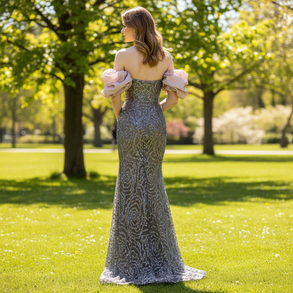 This elegant prom dress features a sweetheart neckline and a detachable pale pink skirt in contrast with the grey dress. With the option to remove the skirt, this dress adds versatility to your wardrobe. Perfect for formal events, the strapless design and contrasting colors make for a stunning and sophisticated look.