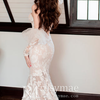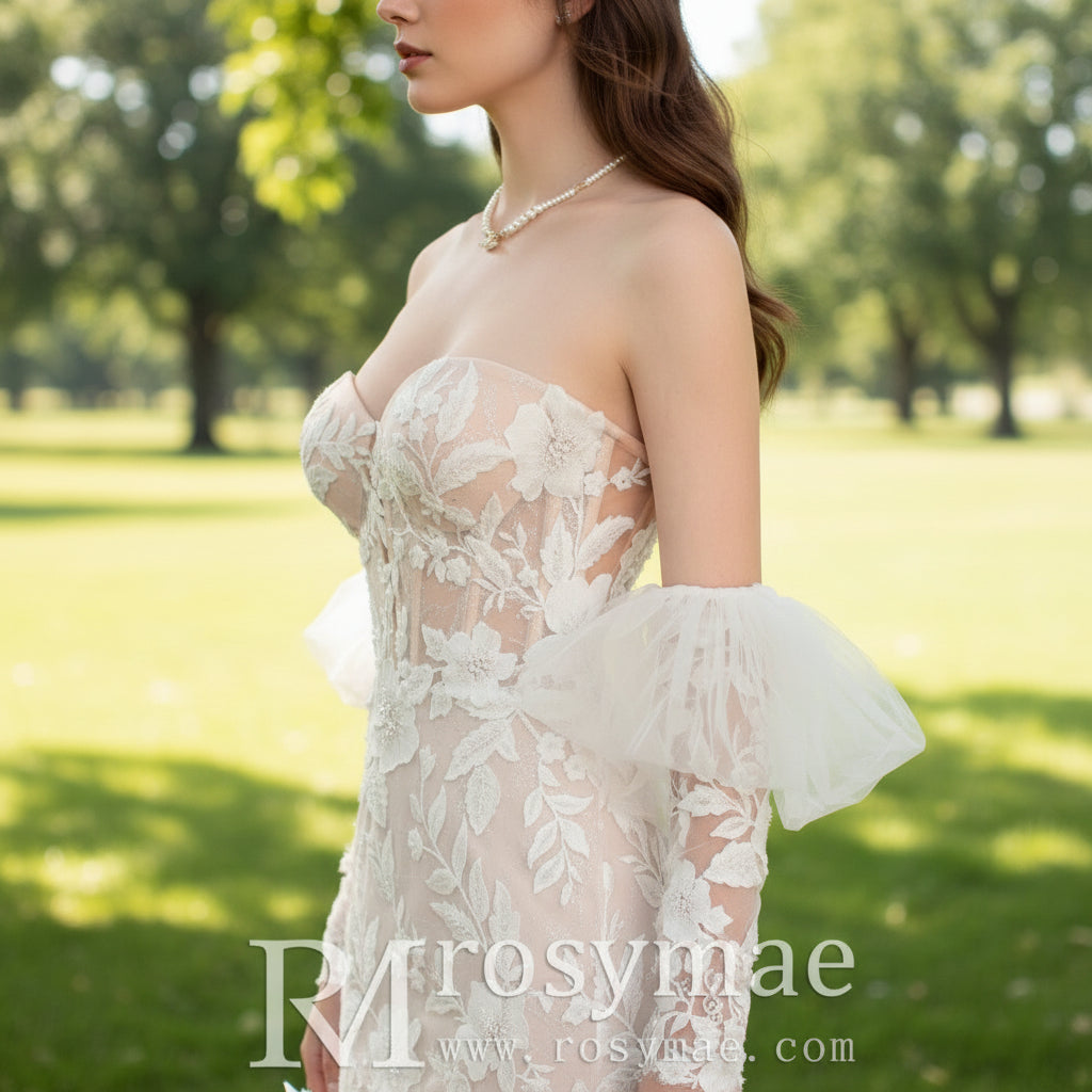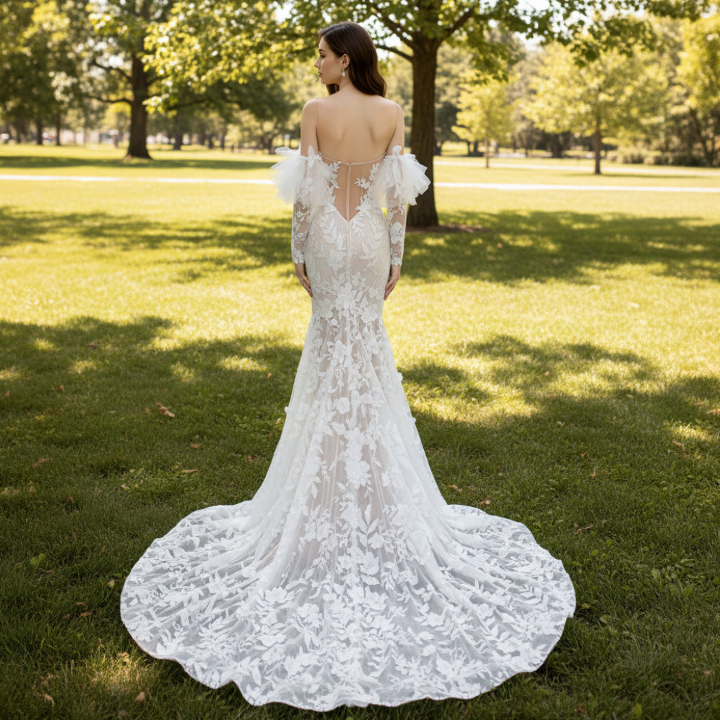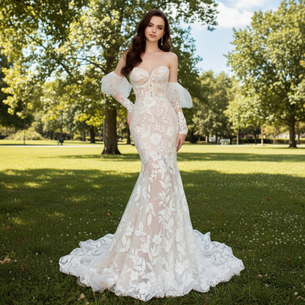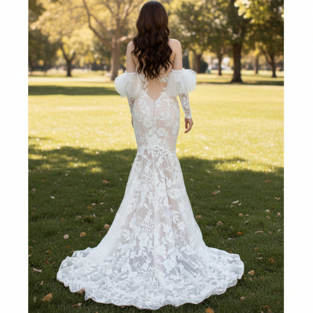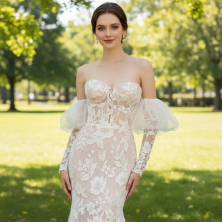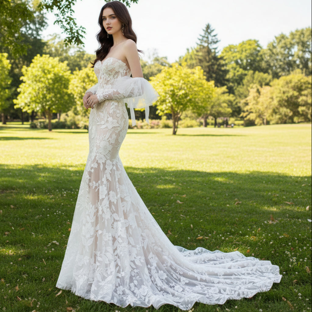 Fall in love with our lace mermaid wedding dress! Perfect for beach weddings, its sheer bodice and skirt add a touch of whimsy to your special day. With a romantic sweetheart neckline, this dress is sure to make you feel like a mermaid princess. Say "I do" in style and grace.