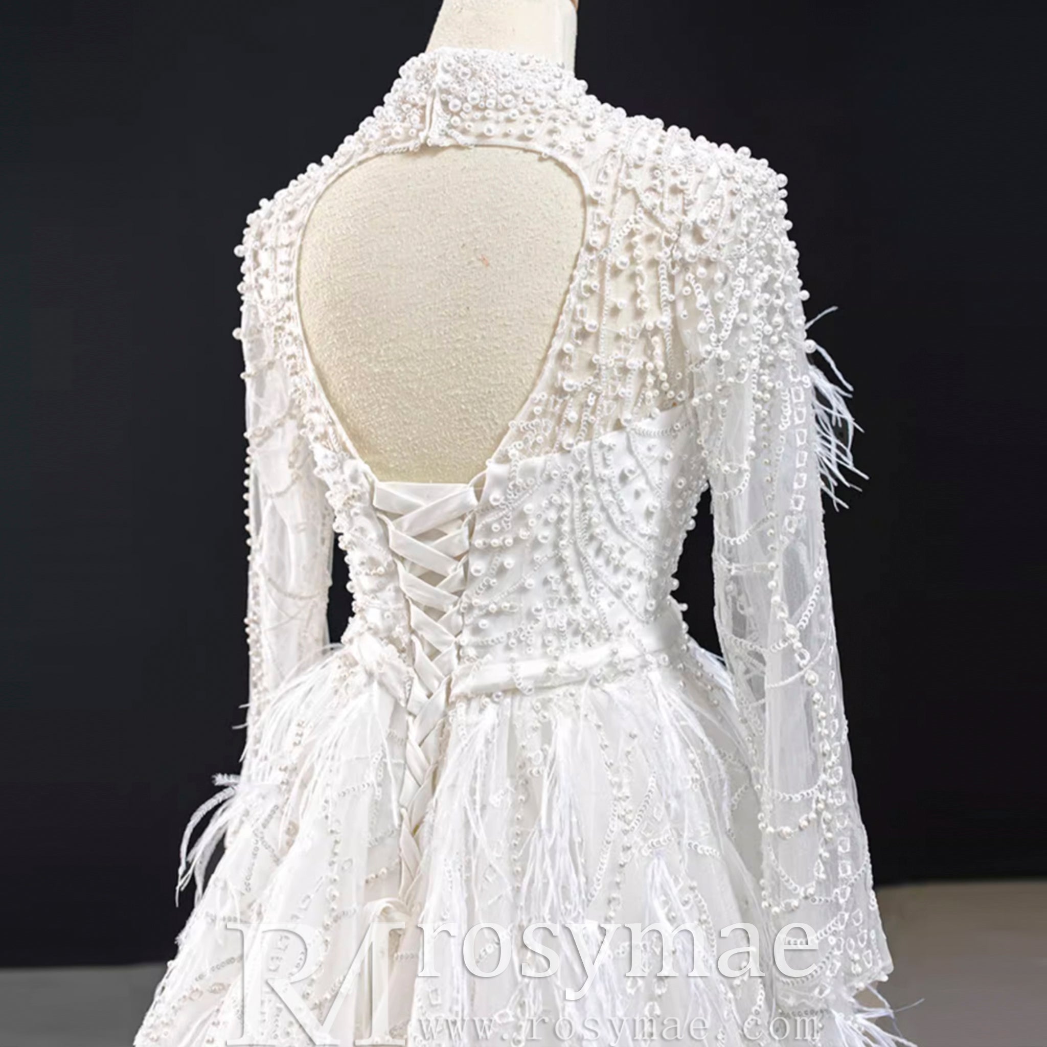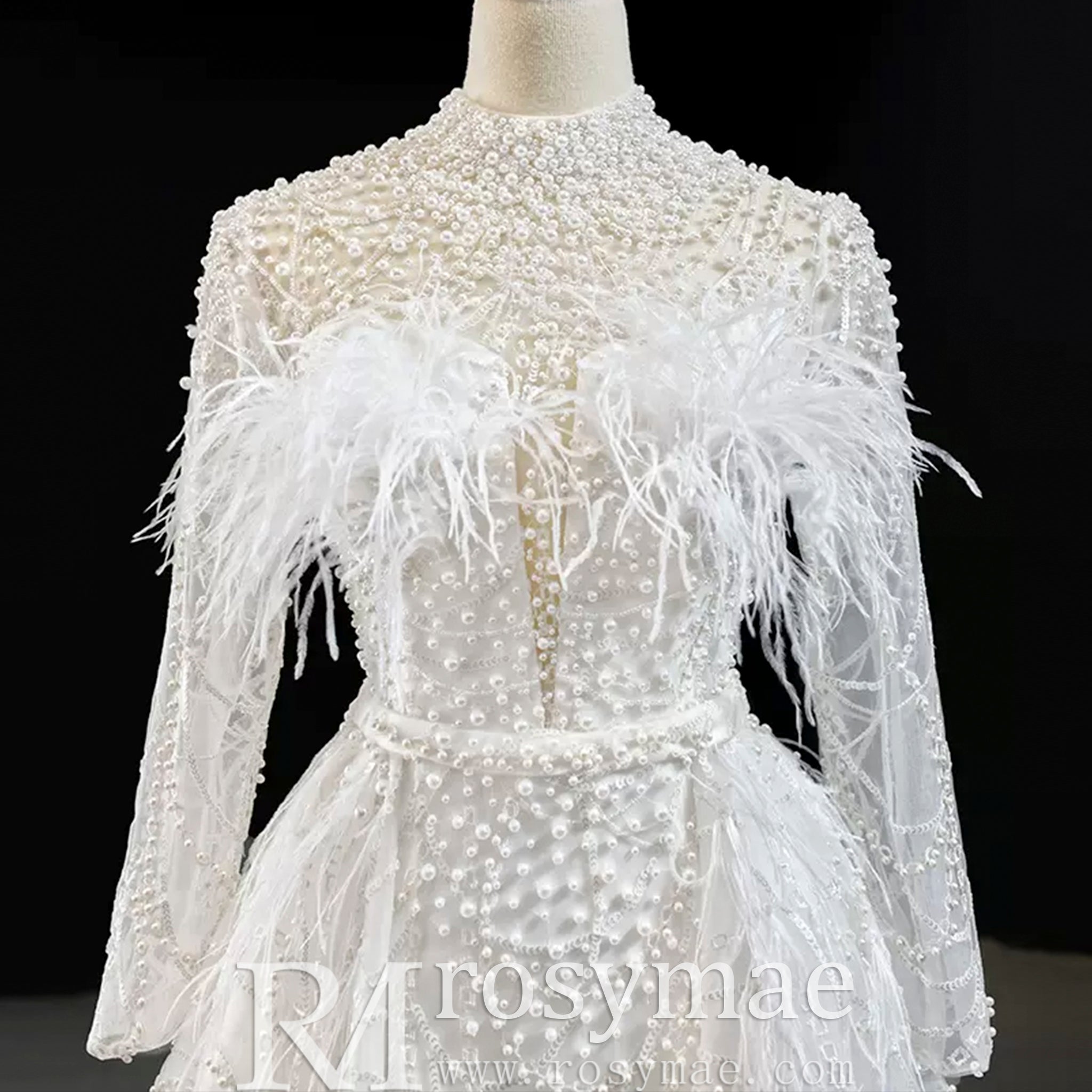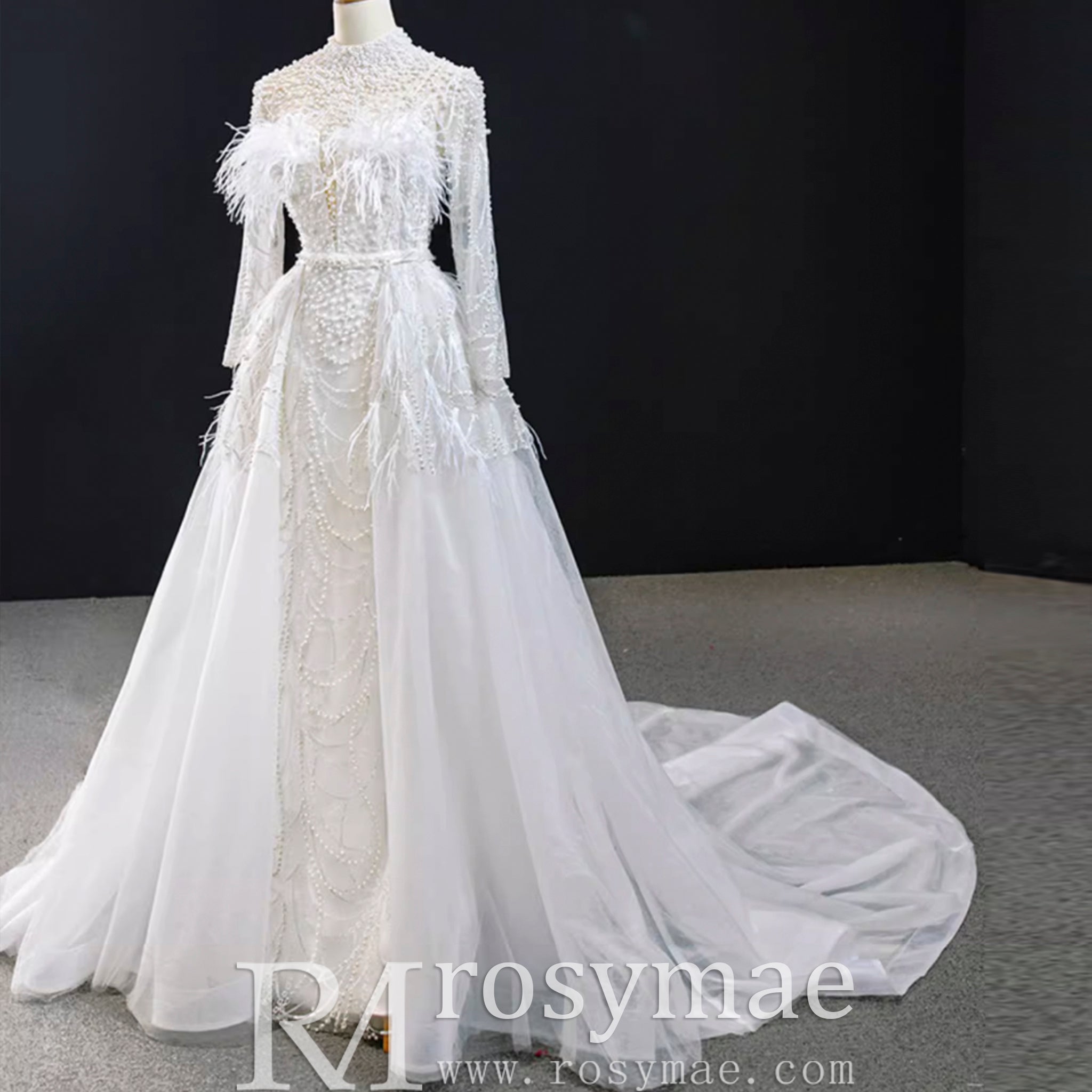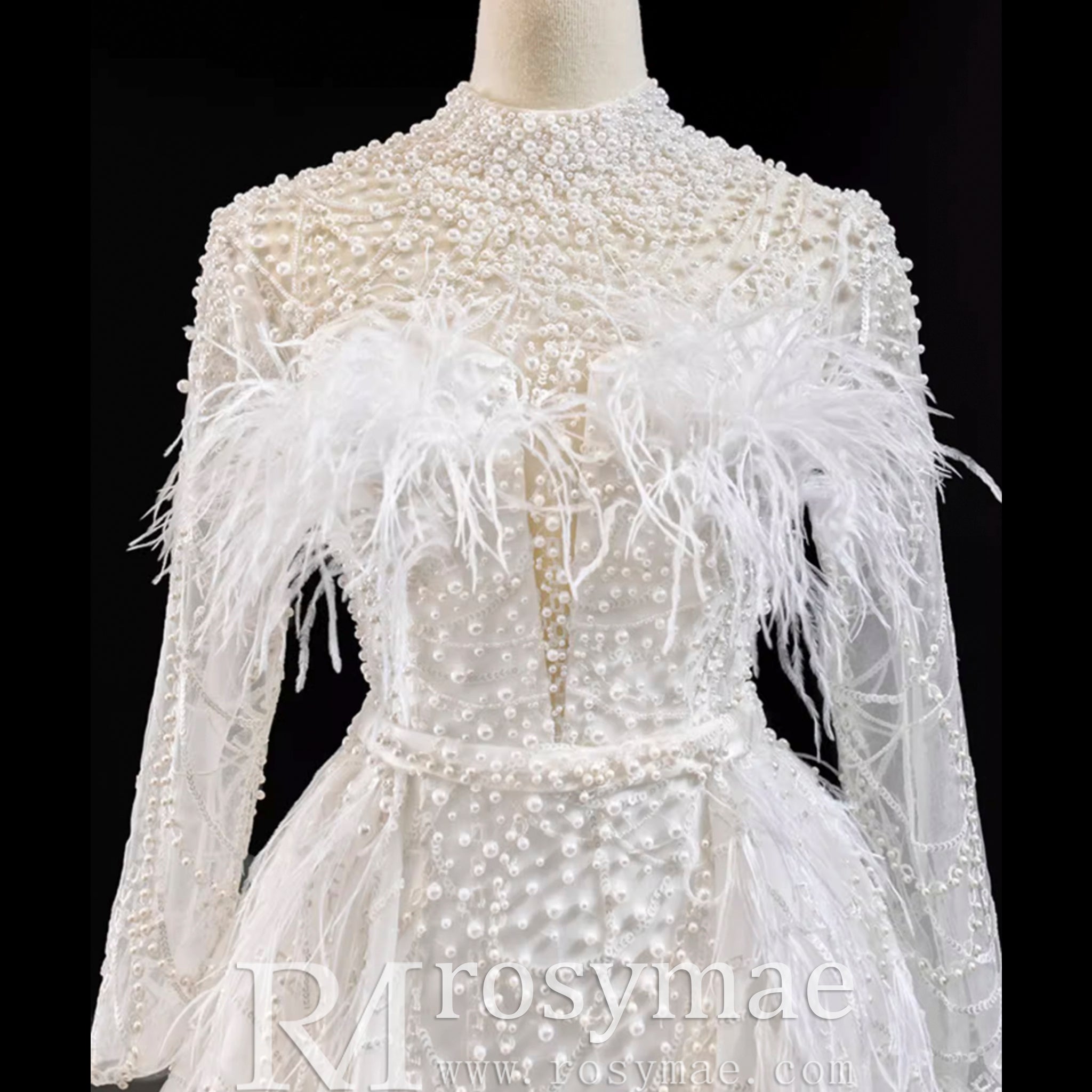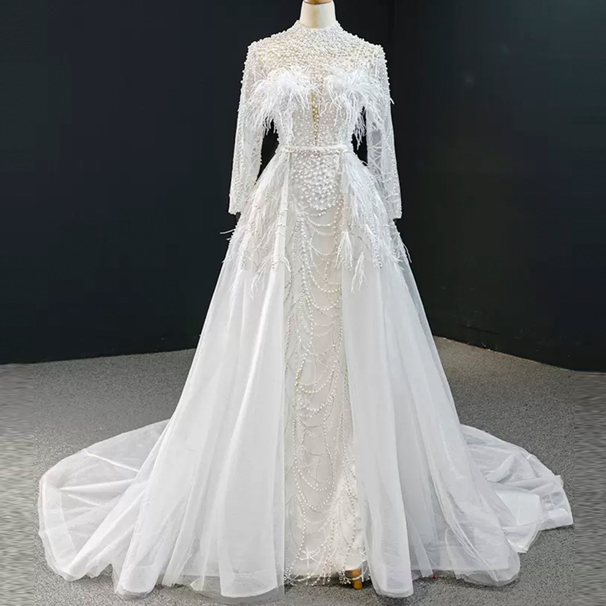 Gorgeous Pearls Ostrich Wedding Dress with Detachable Skirt