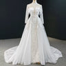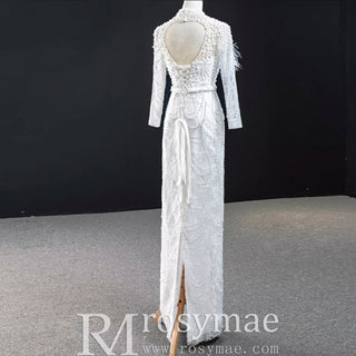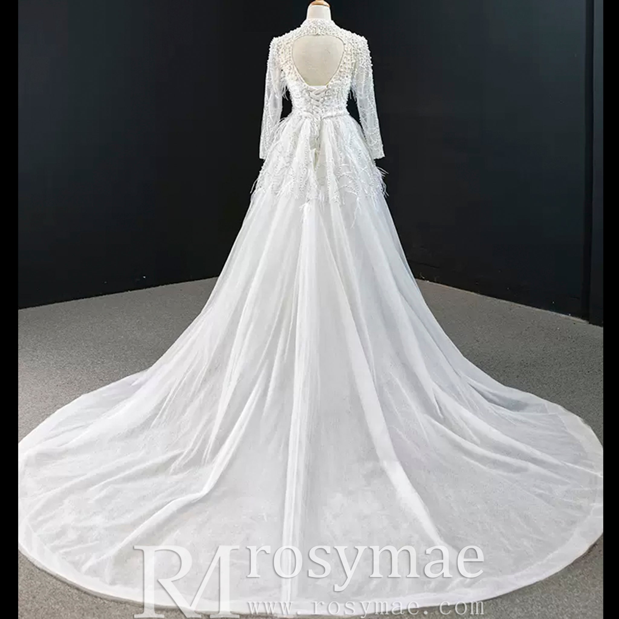 This exquisite wedding dress features intricate sequins and shimmering pearls, adding a touch of glamour to your special day. The high O-neck and sheer long sleeves create a beautiful silhouette, while the sheer neckline and slit back add a touch of sensuality. With a detachable skirt and keyhole back, this dress offers versatility and style in one stunning package!