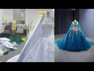 This handmade 3D flowers ball gown quinceanera dress exudes vintage and high-end elegance, featuring a stunning blue color and intricate pearl, applique, and sequin detailing. The halter neckline and sleeveless design add a touch of modernity to this classic ball gown silhouette, making it the perfect choice for prom or pageants. Complete with a matching cape, this floor-length dress will make you feel like a true queen.