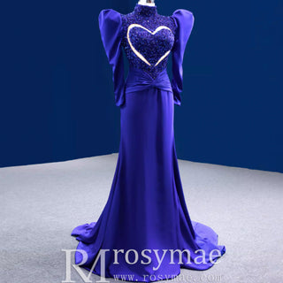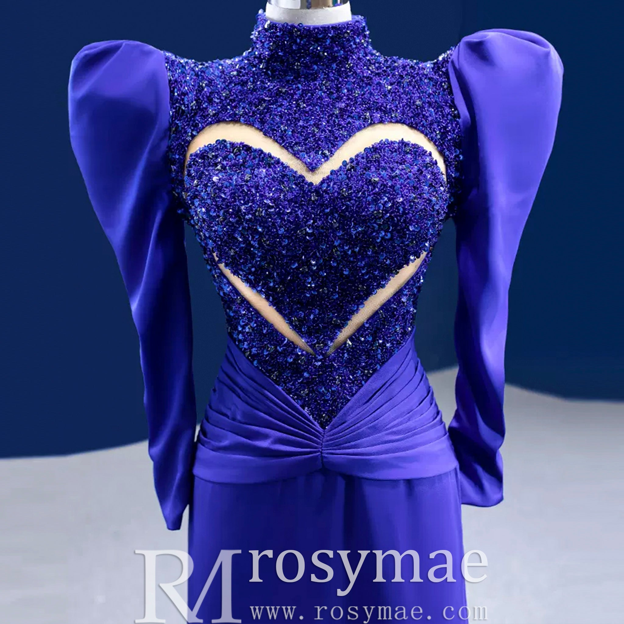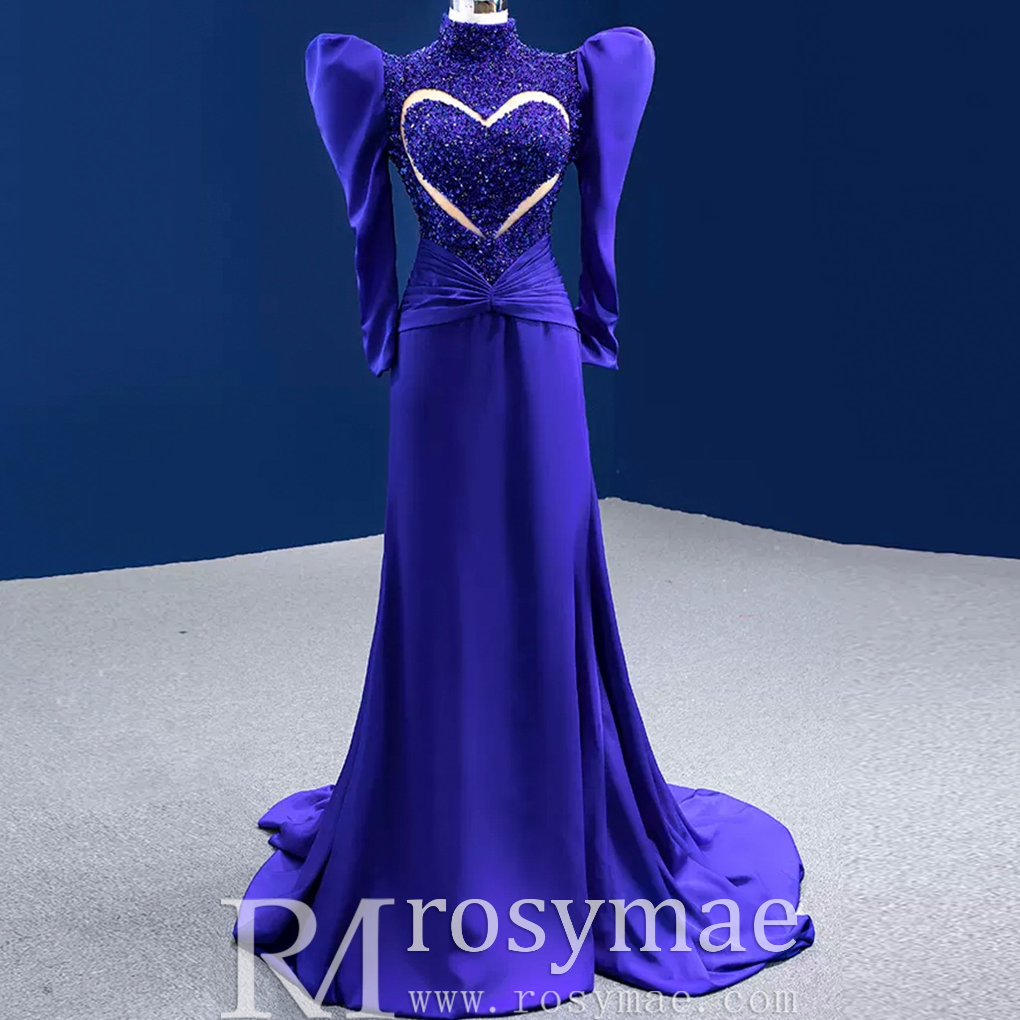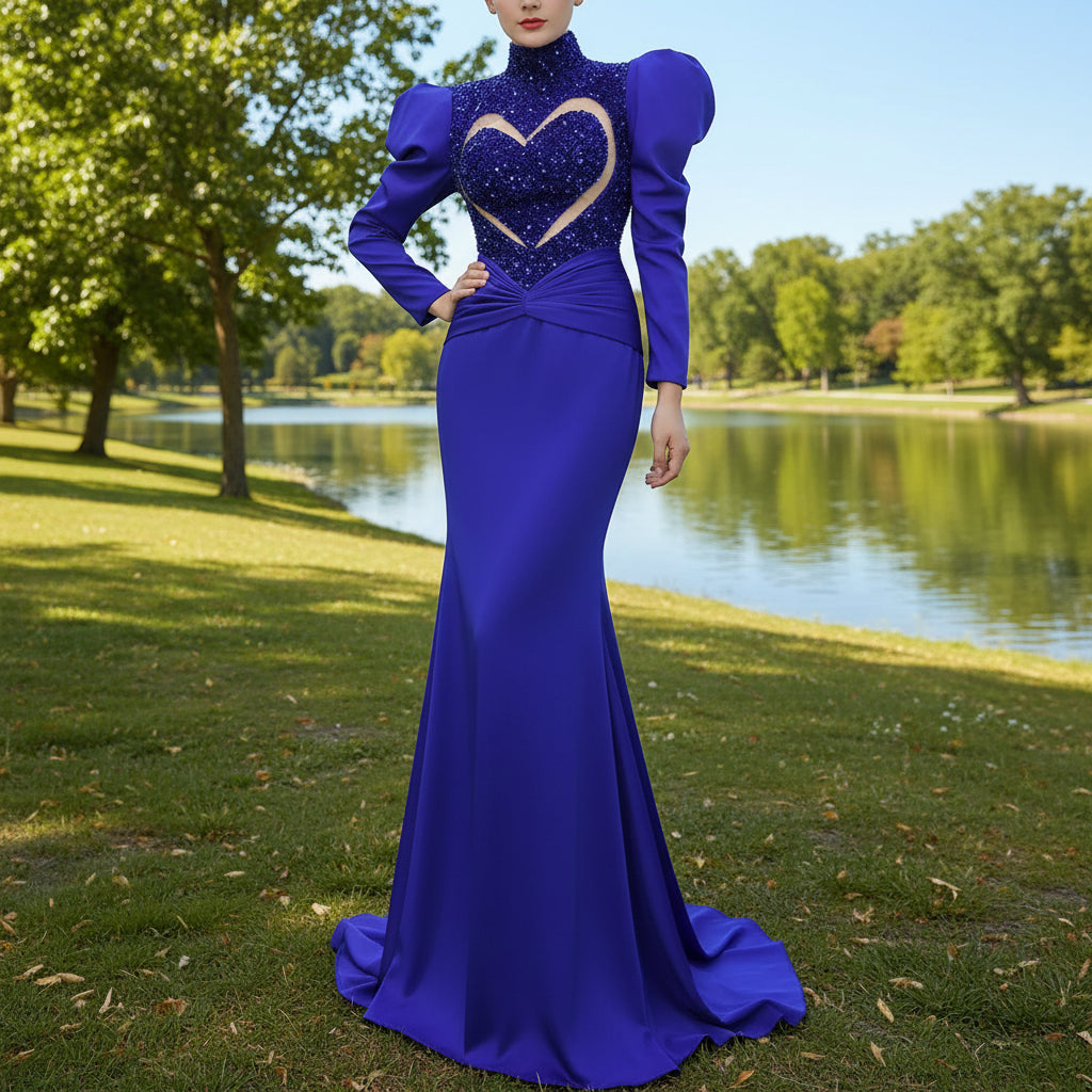 Experience the luxury of our high-end, vintage royal blue evening dress! Handmade with delicate beading and a flattering fit-and-flare silhouette, this dress exudes retro elegance. The high neck and sheer bodice add a touch of modern flair to the unique design, making it perfect for prom or any special occasion. Embrace timeless beauty with this stunning satin gown.