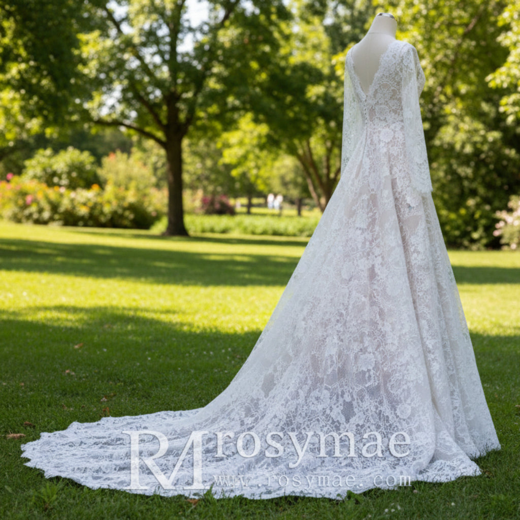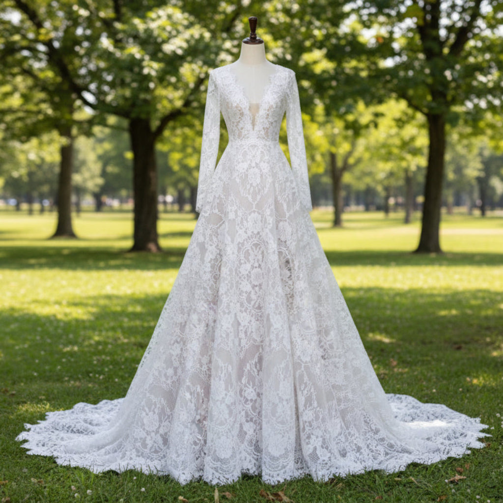 This stunning bridal gown features a delicate floral lace that covers the entire dress, adding texture and elegance to your wedding day look. With a double V neckline and flattering A-line silhouette, this dress is the perfect blend of romance and sophistication. Make a statement on your special day with this beautiful lace wedding dress.
