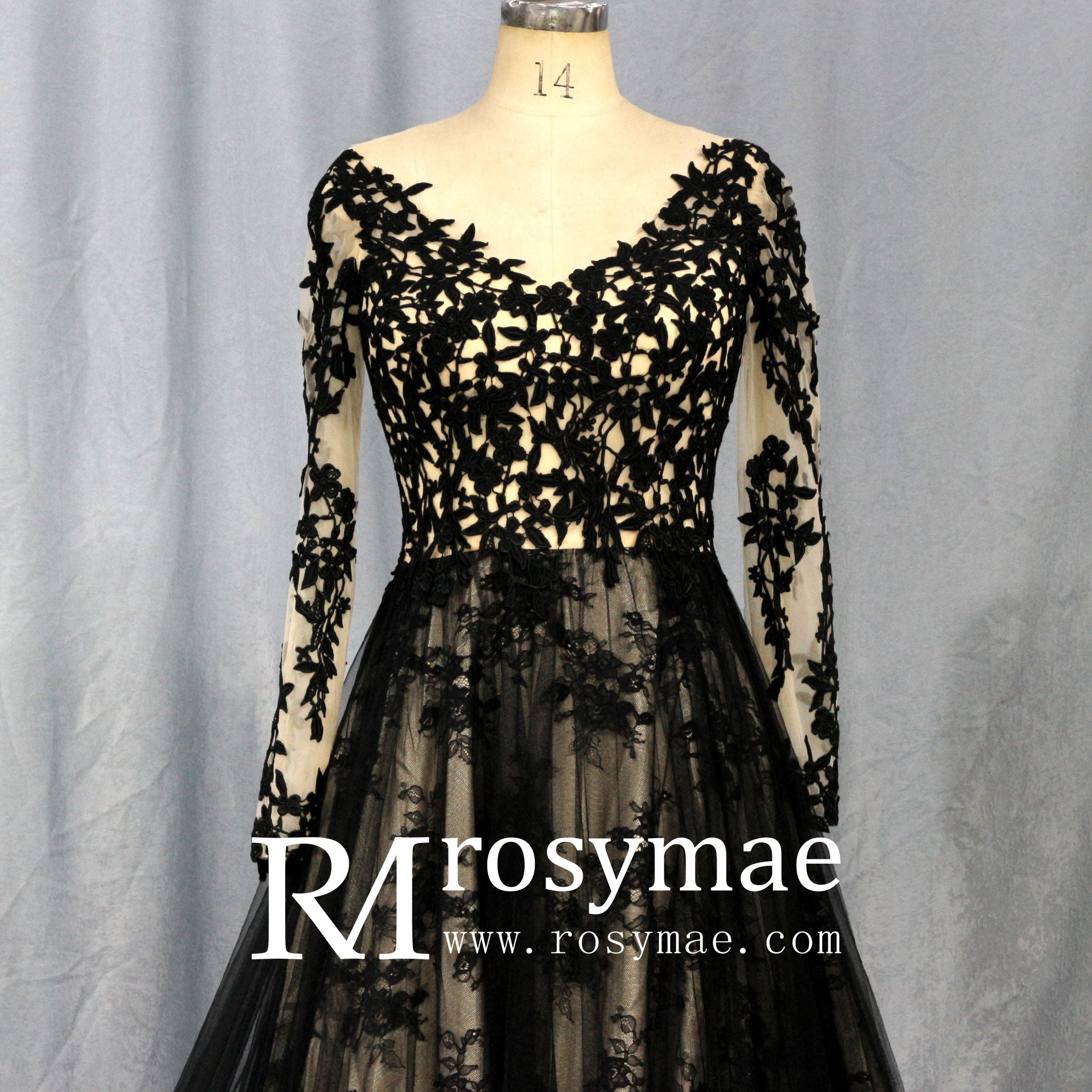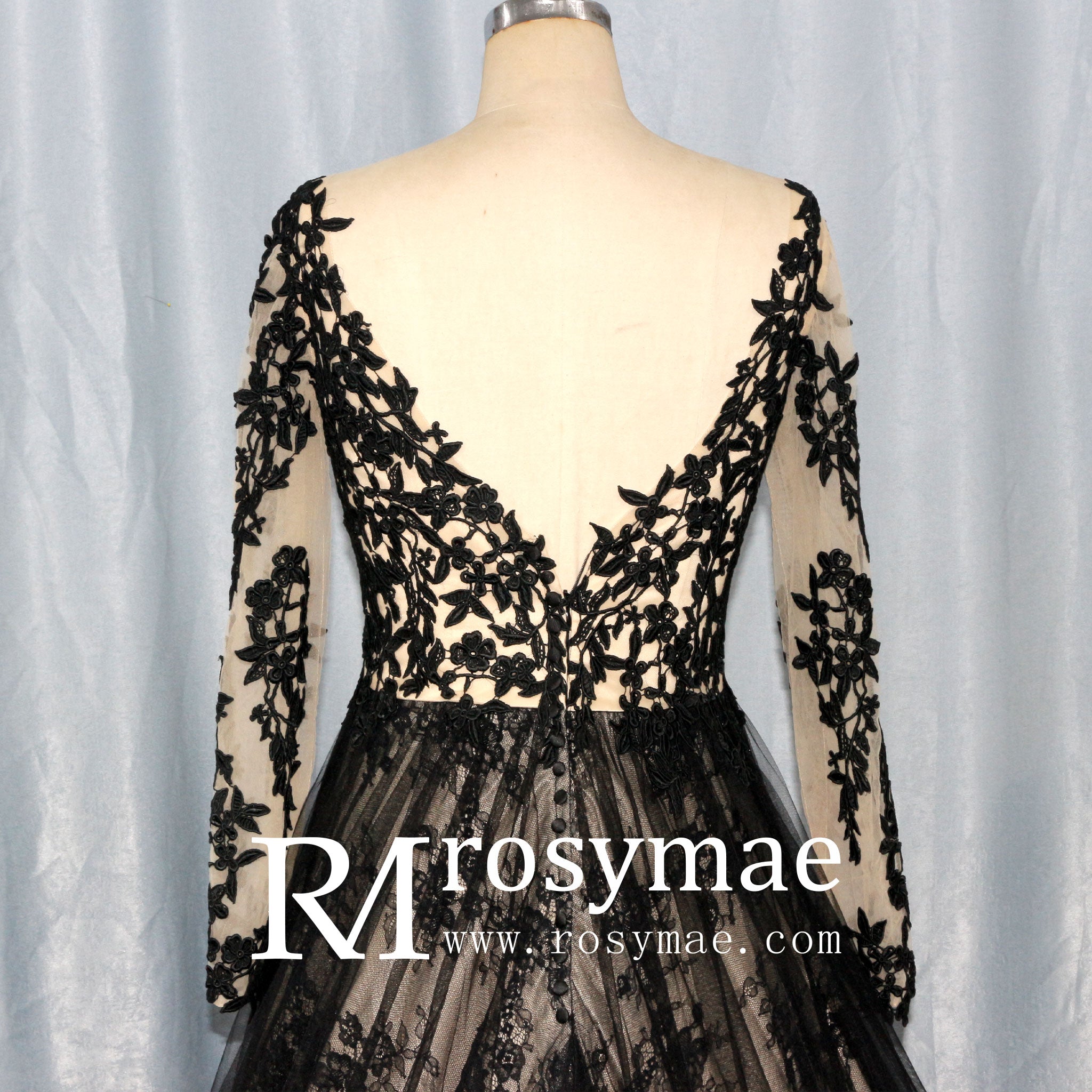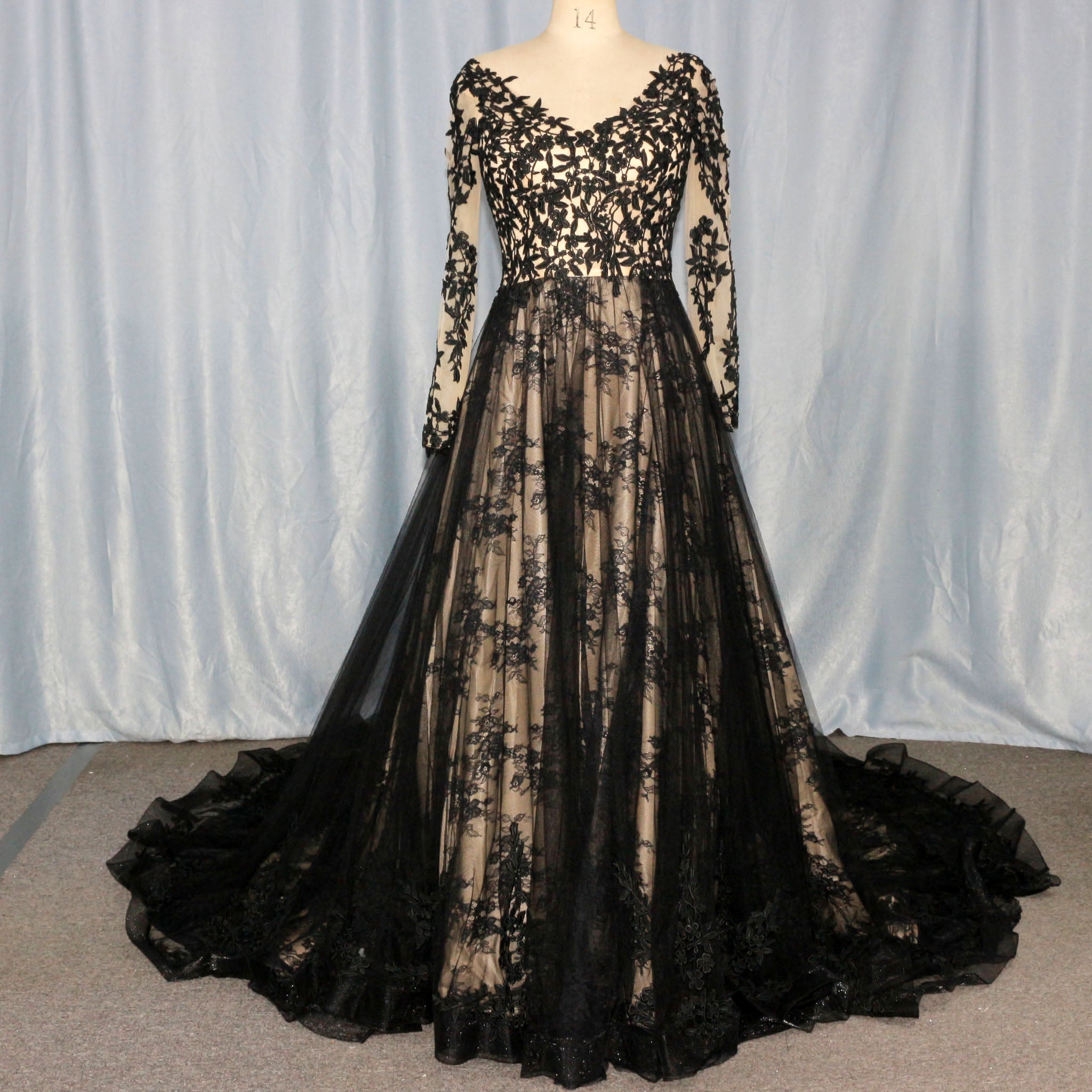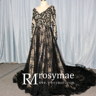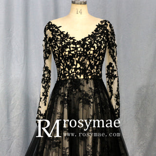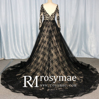 This elegant wedding dress features a flattering V-neckline and a low back, adding a touch of sultry sophistication to your special day. The mix of black and champagne colors creates a striking and unique look. The long sleeves add a classic and modest touch, perfect for any bride.