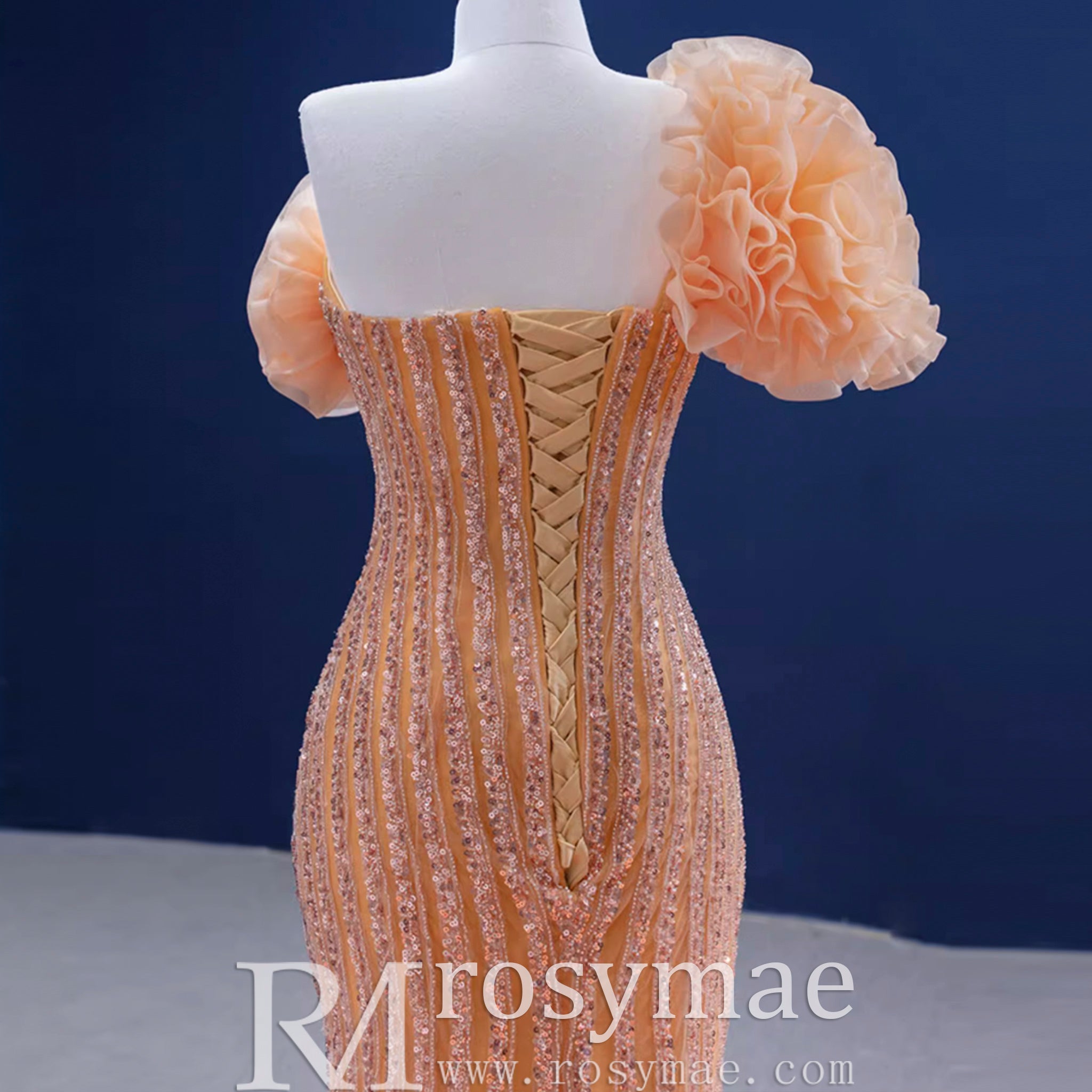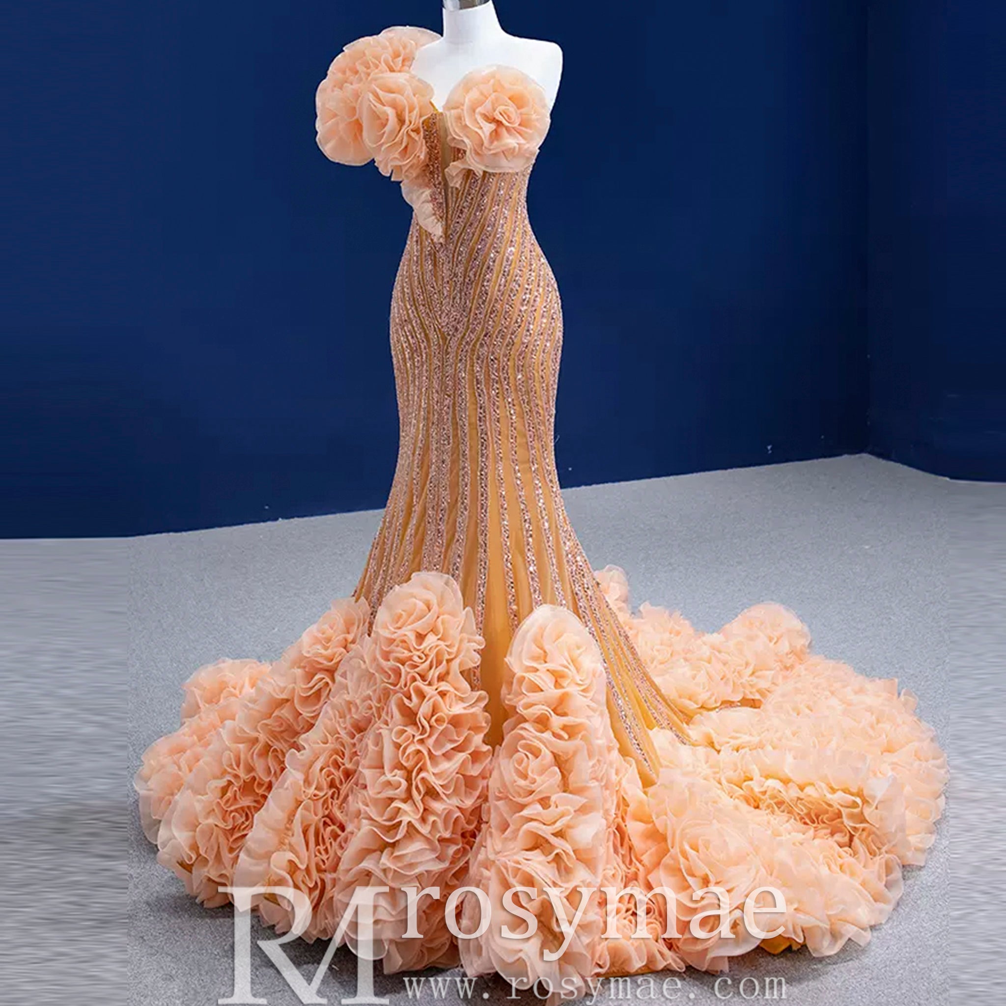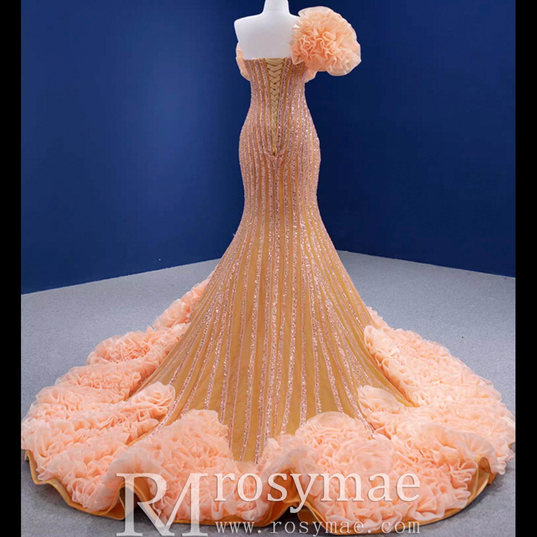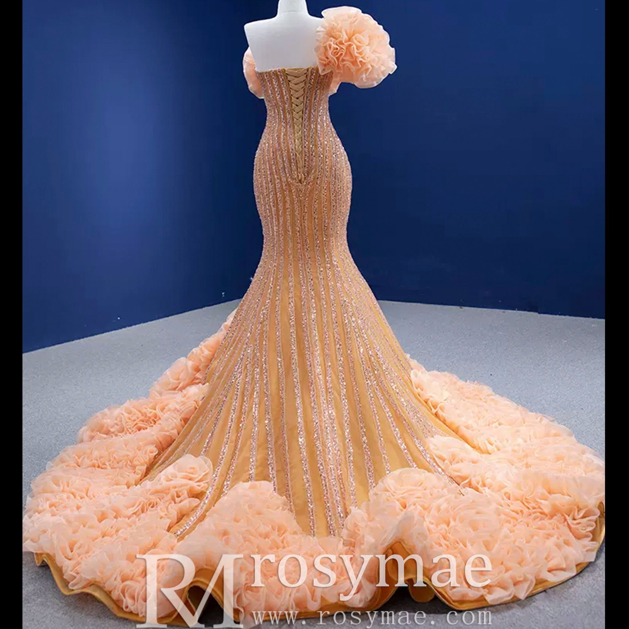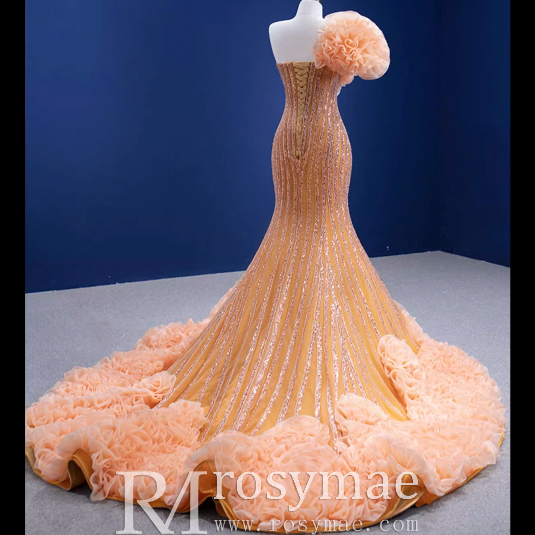 Look stunning in this orange trumpet sequins prom dress or evening gown! The ruffle organza and plunging neckline add a touch of elegance, while the handmade flowers at the top give a unique and handmade touch. Complete your look with the chapel train for a glamorous and show-stopping outfit. Perfect for prom or any special event.