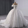 Impress your guests with this organza ball gown wedding dress featuring a sparkling sequin and pearl accents. The off-the-shoulder boat neck adds a touch of elegance while the handmade beading and rhinestones make you shine. The puffy skirt and cathedral train complete this excellent, show-stopping look.