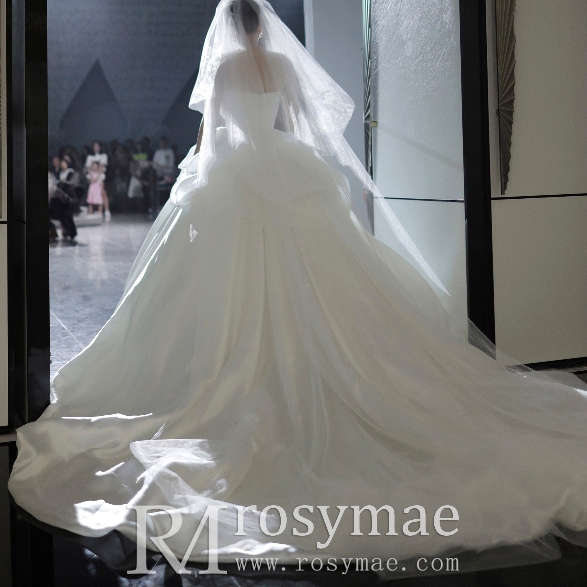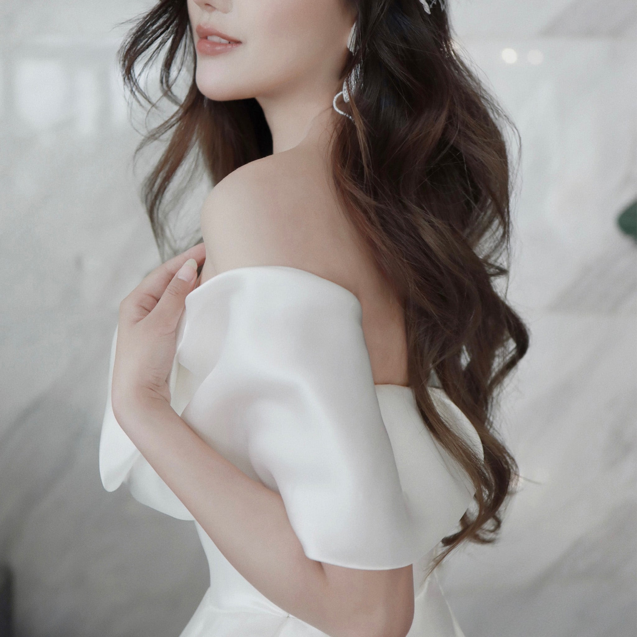 Elevate your wedding day look with our elegant satin wedding dress. The off-the-shoulder neckline adds a touch of romance while the chapel train creates a grand entrance. The v-neckline flatters your figure and accentuates your neckline, making you feel confident and beautiful on your special day.