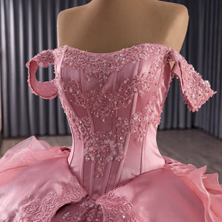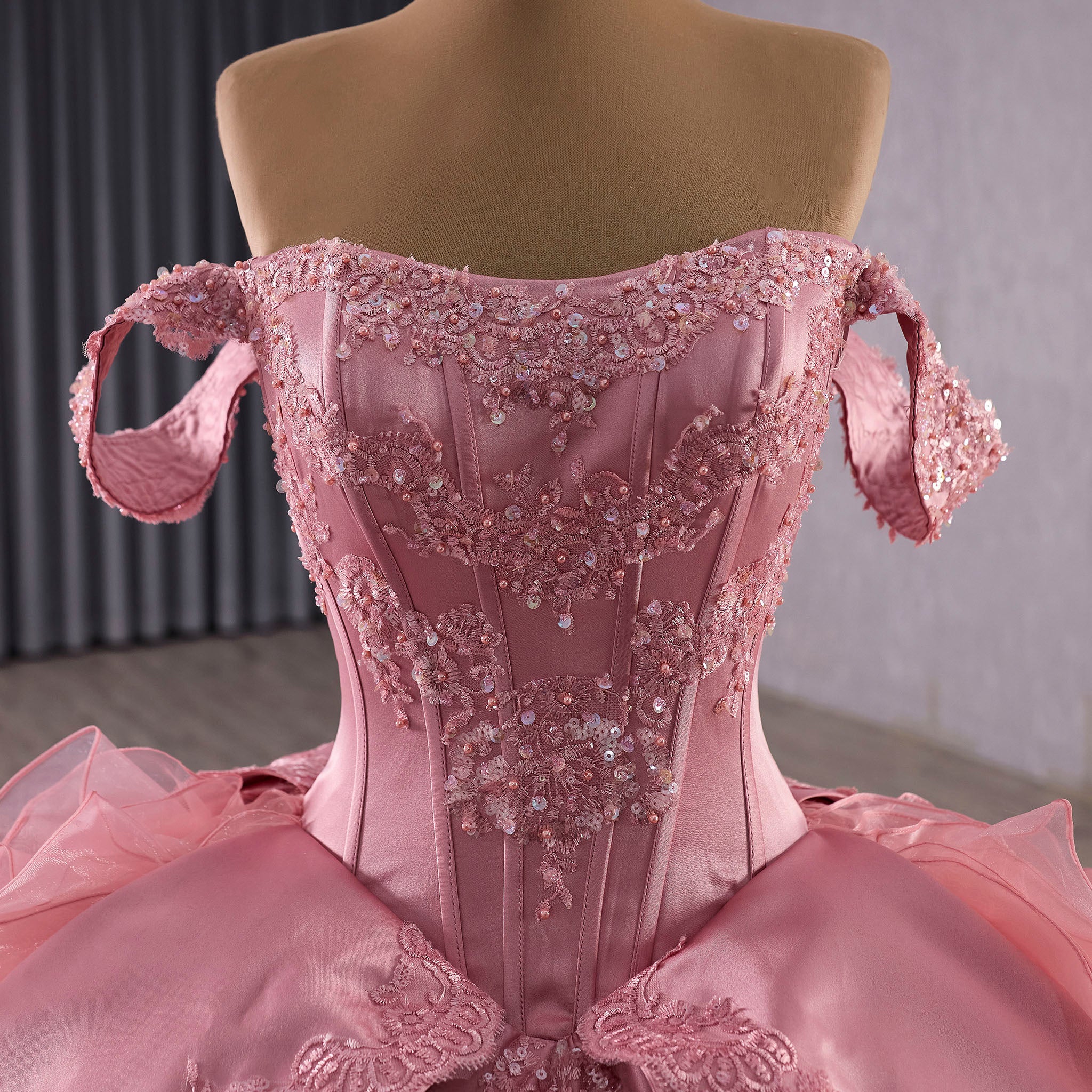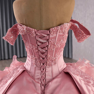 Walk down the aisle or into your quinceañera celebration in this breathtaking pink ball gown that embodies romance and sophistication. The dramatic, voluminous ruffle skirt creates an unforgettable silhouette that commands attention with every step, while the luxurious fabric drapes beautifully to enhance your natural grace. The expertly tailored basque waist cinches elegantly at your curves, creating a flattering hourglass shape that celebrates your femininity and confidence. What truly distinguishes this gown is its stunning bodice, adorned with hand-beaded lace appliqués that showcase exceptional artisanal craftsmanship. Each bead is meticulously placed to create intricate patterns and dimensional texture, catching light beautifully as you move. The combination of delicate beadwork and flowing ruffles creates a harmonious balance between classic elegance and contemporary glamour. Beyond its visual splendor, this dress is engineered for comfort, allowing you to dance, celebrate, and enjoy your special day without compromise. The premium construction and thoughtful design details ensure this gown will become a cherished heirloom piece. Whether you're marking a milestone celebration or saying "I do," this romantic gown delivers the perfect blend of timeless beauty, expert tailoring, and unforgettable presence that makes your moment truly magical.