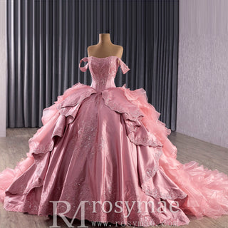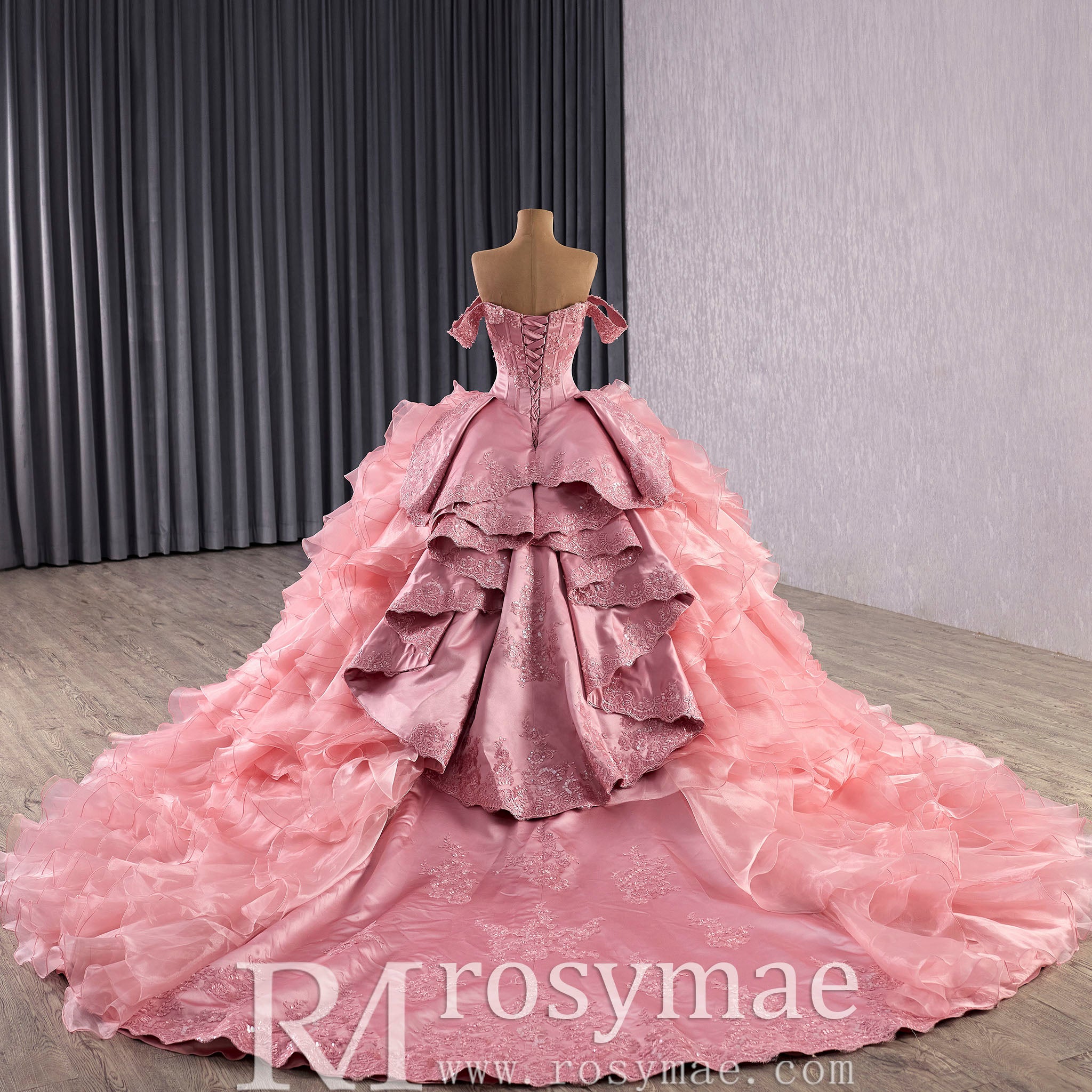 Romantic Off the Shoulder Ball Gown Pink Wedding Dress with Ruffle Skirt