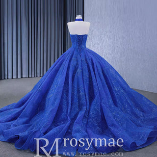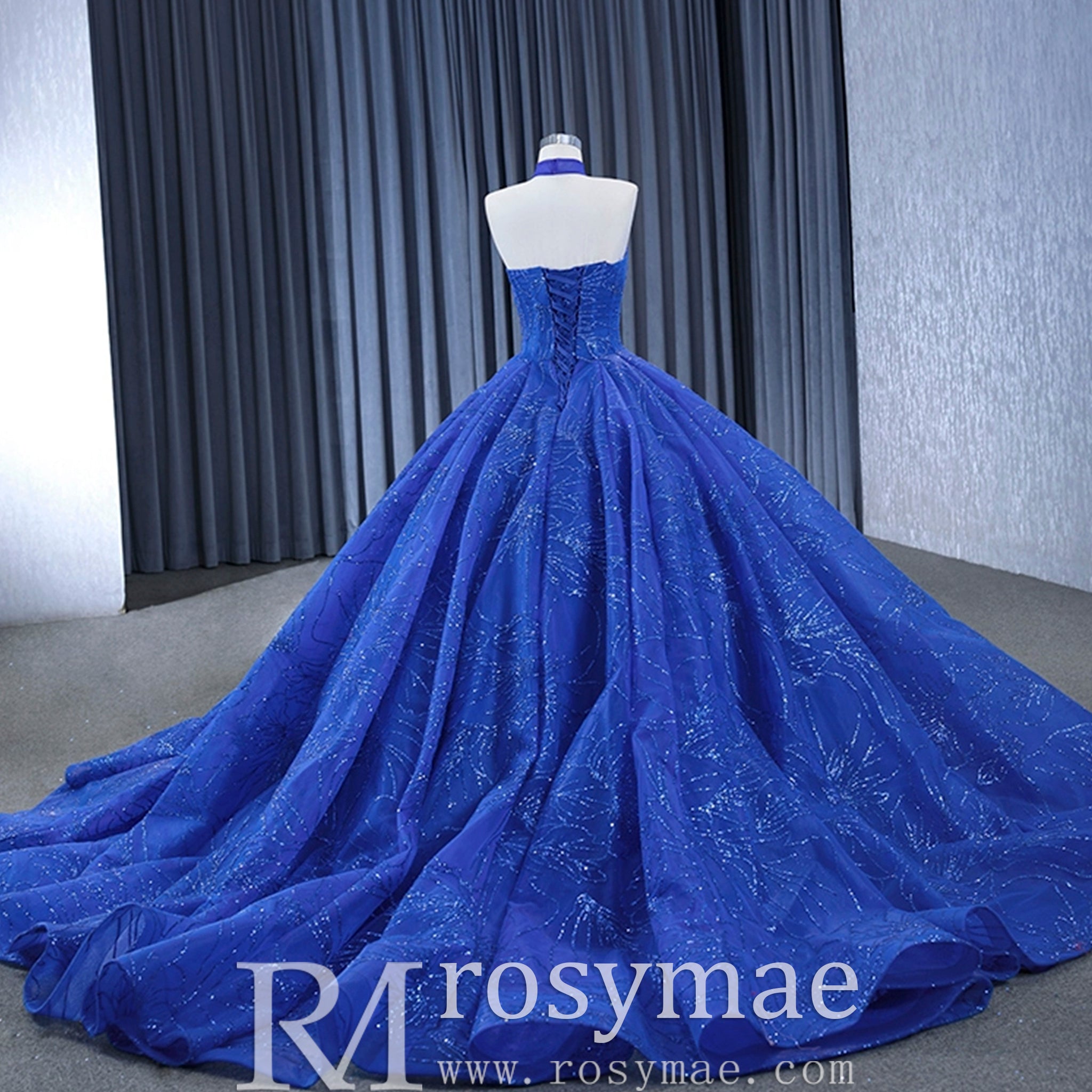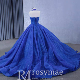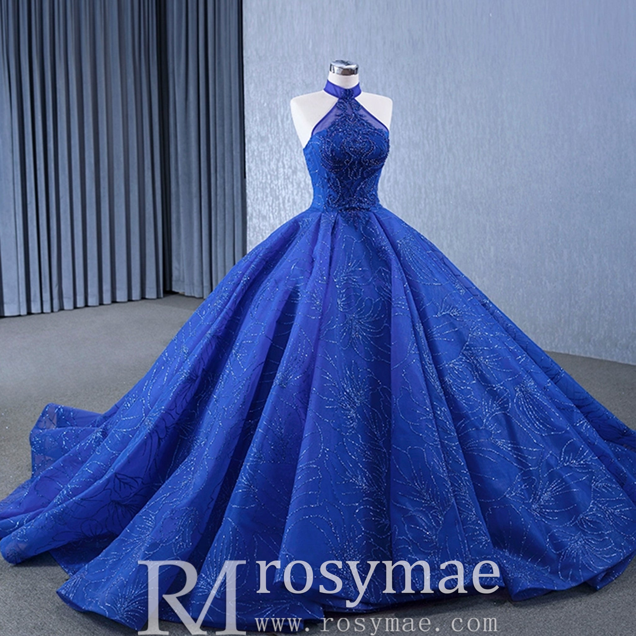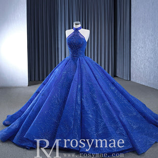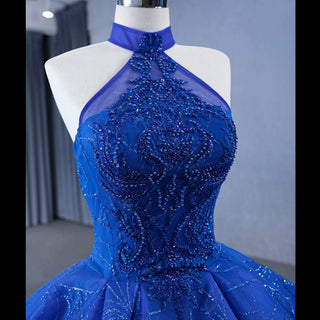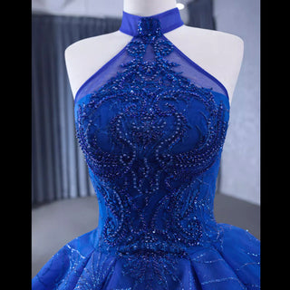 Command attention in this exquisite royal blue gown, where luxury craftsmanship meets timeless design. The elegant halter neckline and sleeveless bodice are adorned with intricate handmade beading and shimmering sequins, creating a radiant effect. A dramatic low back adds a modern touch, while the graceful chapel train ensures a show-stopping entrance. Perfect for prom, quinceañera, or any formal gala, this stunning gown is designed to make you feel confident and unforgettable throughout your celebration.