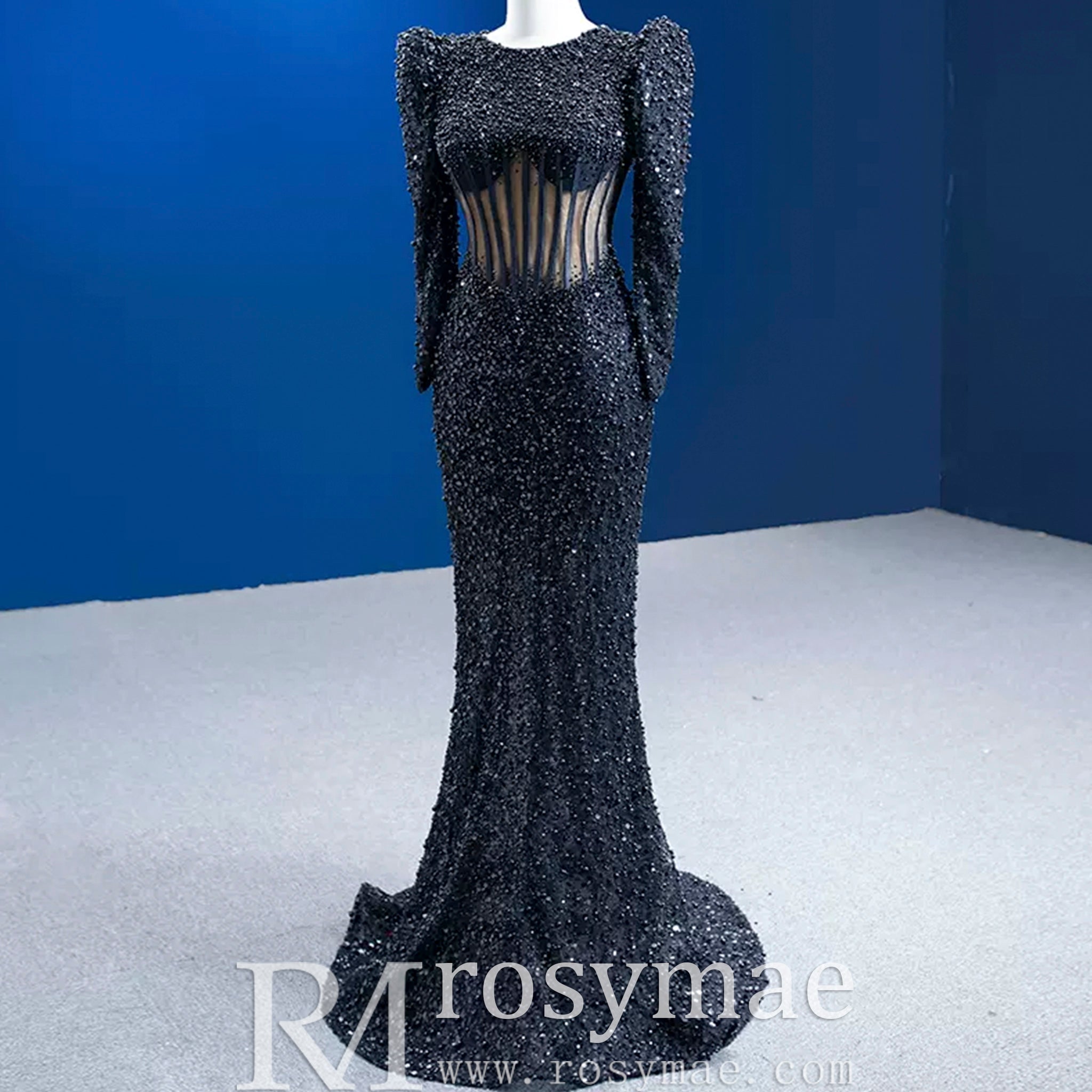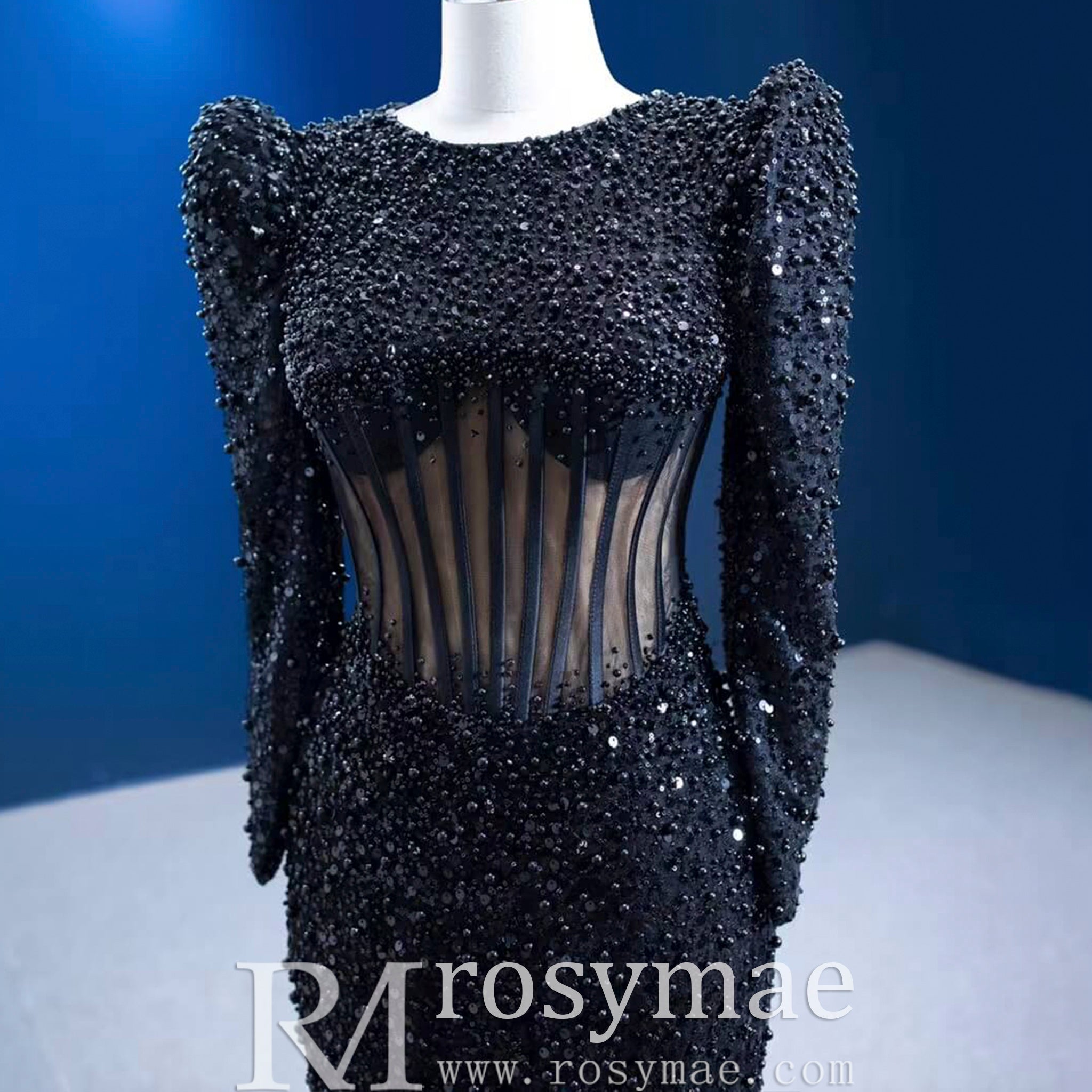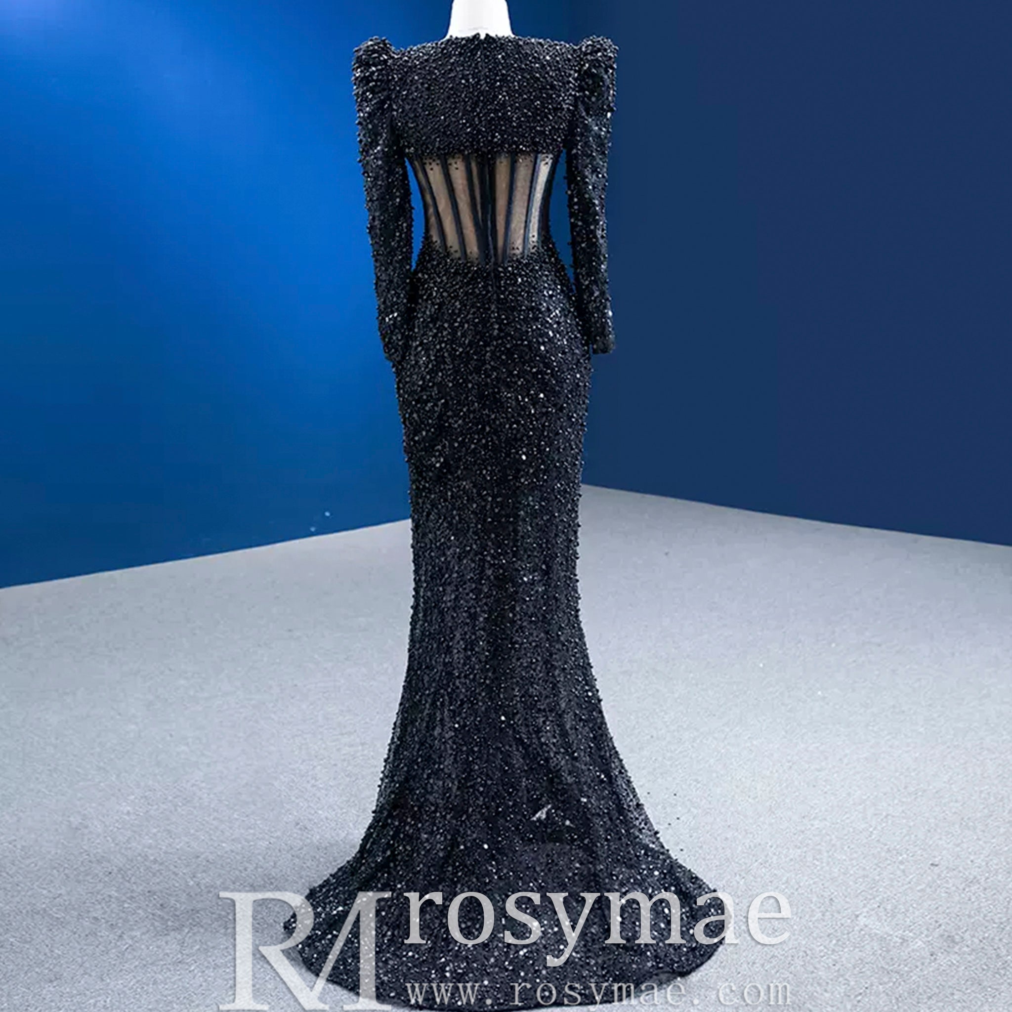 Dazzle the crowd with this handmade sheer bodice black mermaid evening dress! Featuring puffy long sleeves, sparkling sequins and beautiful beading, this dress exudes elegance and luxury. The high back and brush train add a touch of sophistication to this stunning prom gown. Make a lasting impression at any event in our one-of-a-kind dress.