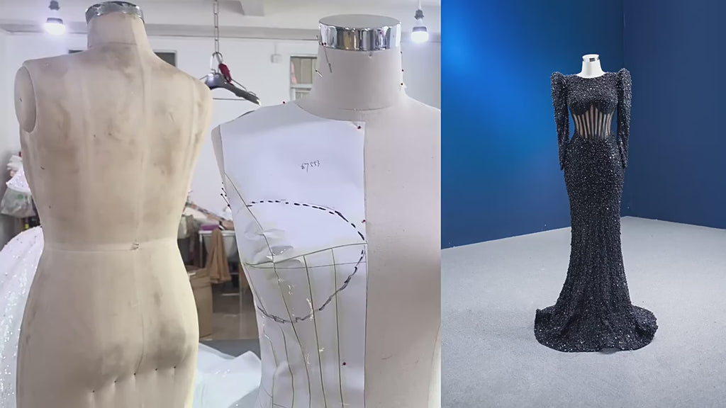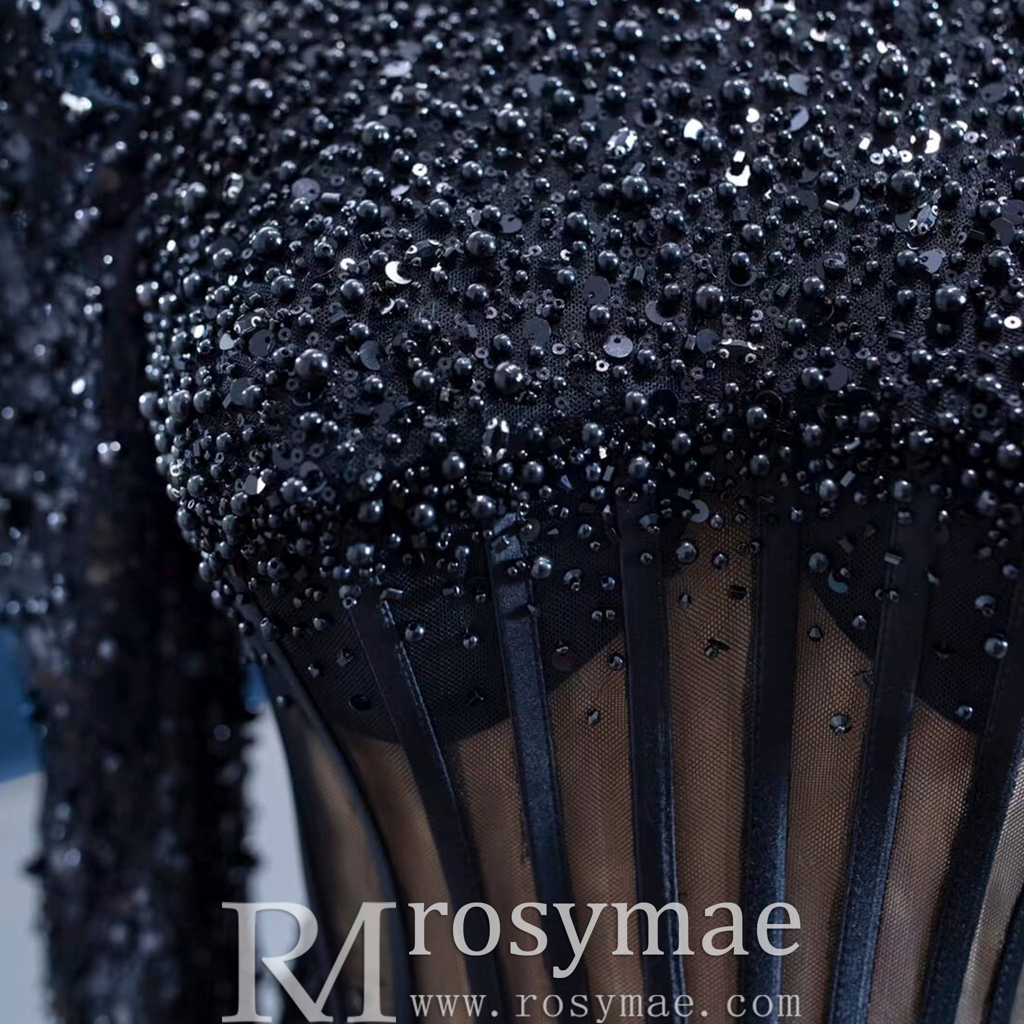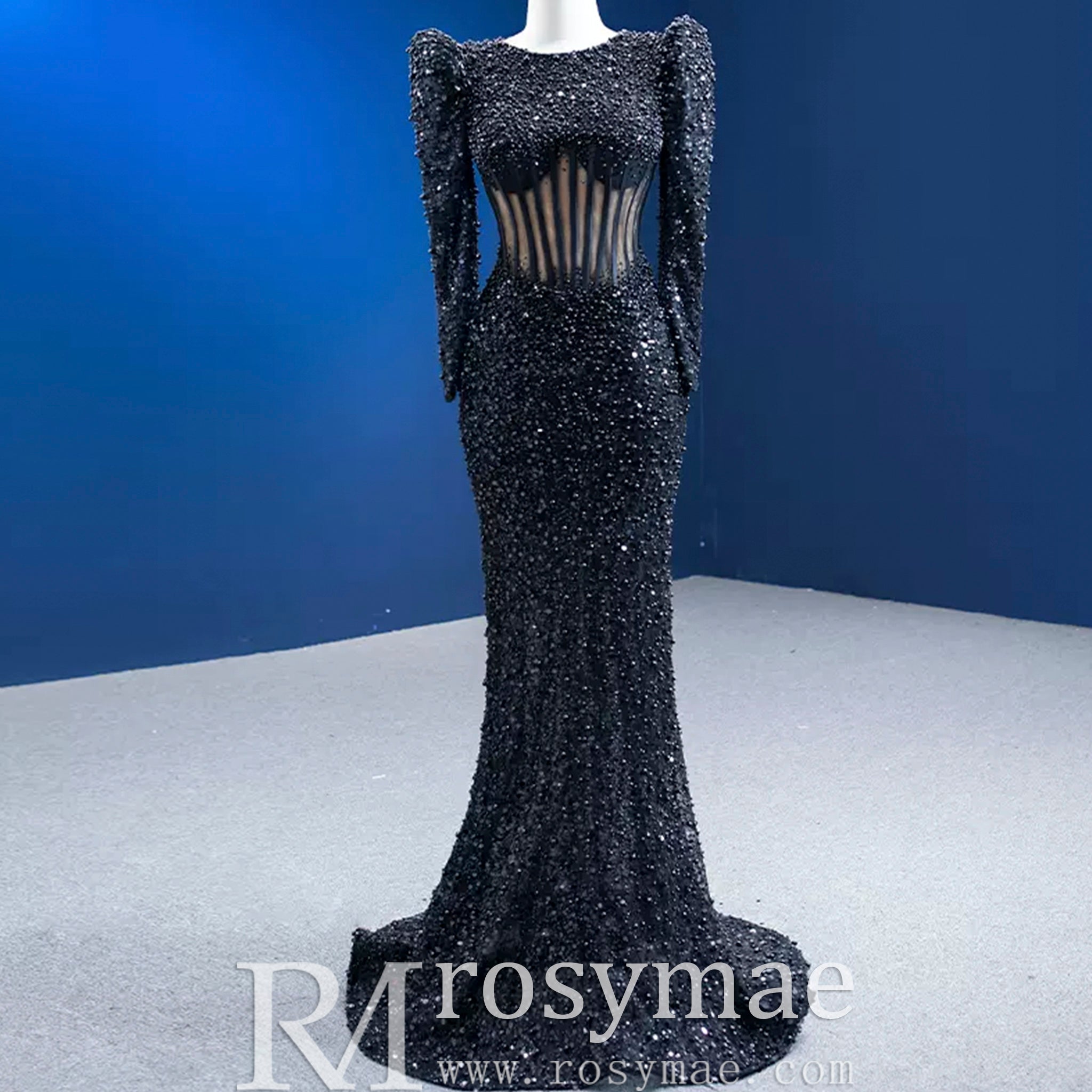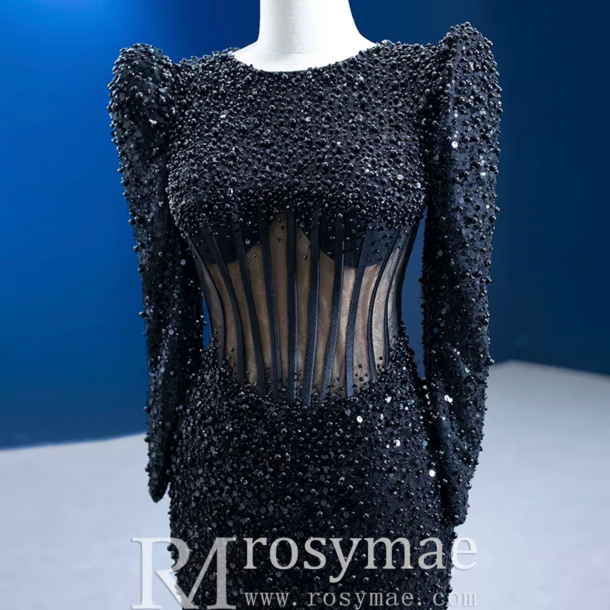 Dazzle the crowd with this handmade sheer bodice black mermaid evening dress! Featuring puffy long sleeves, sparkling sequins and beautiful beading, this dress exudes elegance and luxury. The high back and brush train add a touch of sophistication to this stunning prom gown. Make a lasting impression at any event in our one-of-a-kind dress.