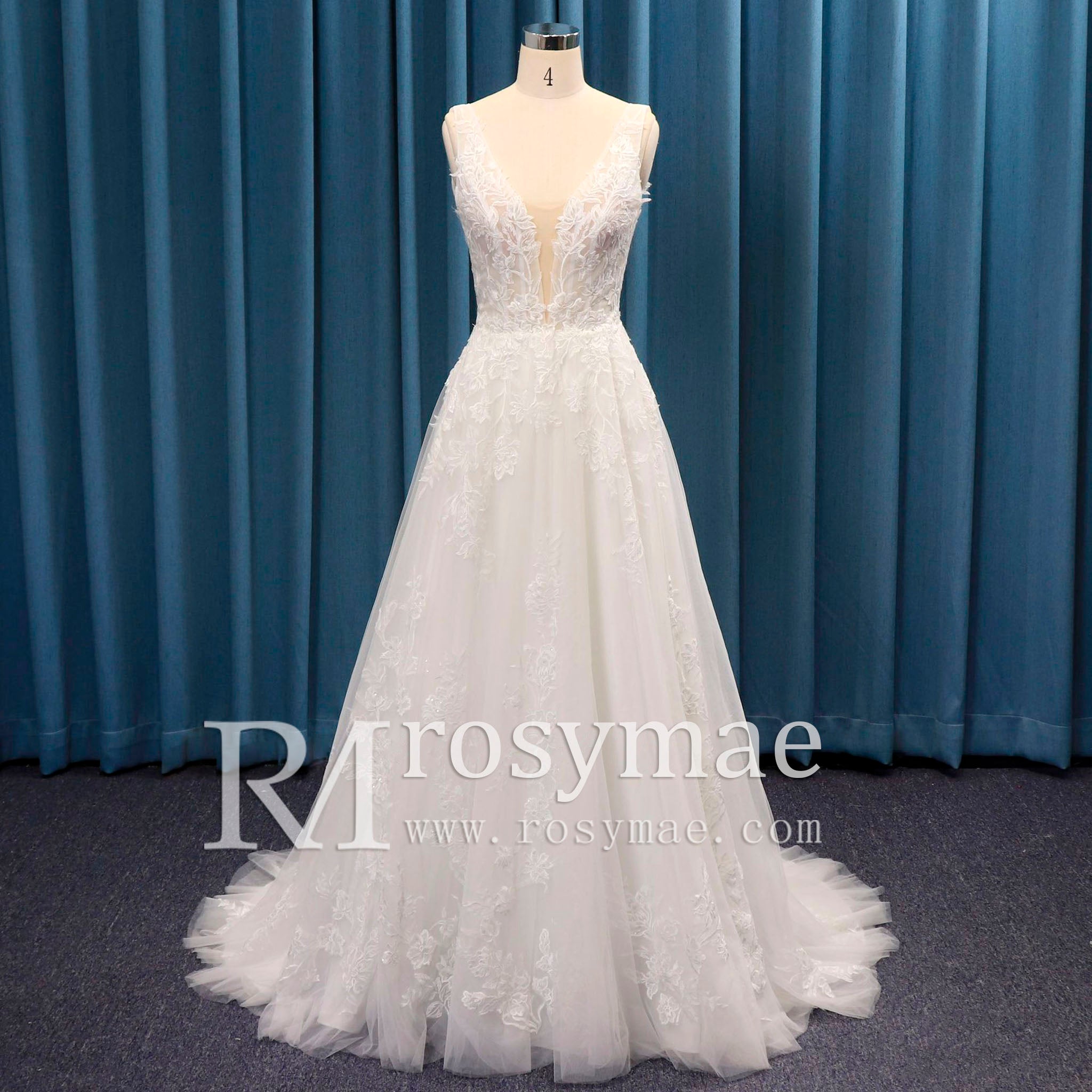 Sheer Bodice Deep Double V Tank Top Bridal Gown Wedding Dress