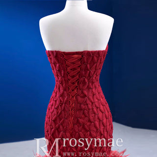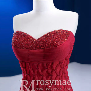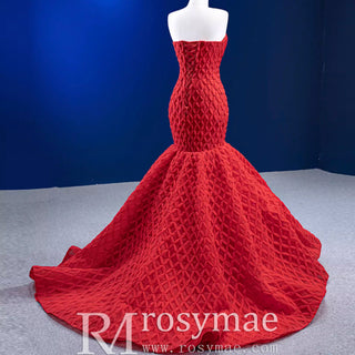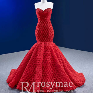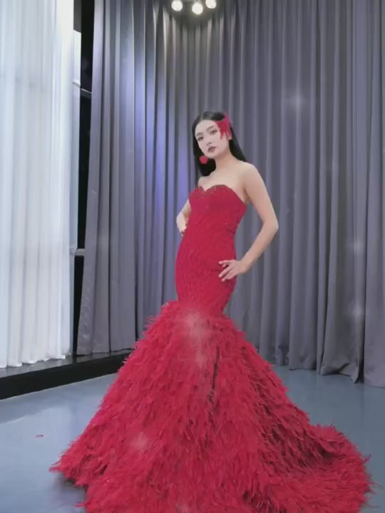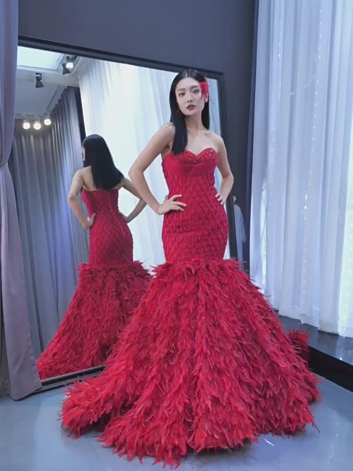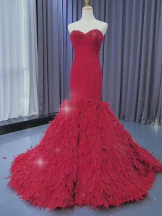 Elevate your wedding look with this sweetheart trumpet luxury wedding dress. This handmade dress features a unique design with a strapless neckline and stunning feather detailing. The vibrant red color adds a touch of boldness, while the chapel train adds a touch of elegance. An excellent choice for the bride who wants to make a statement on her special day!