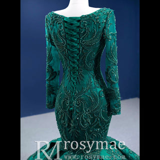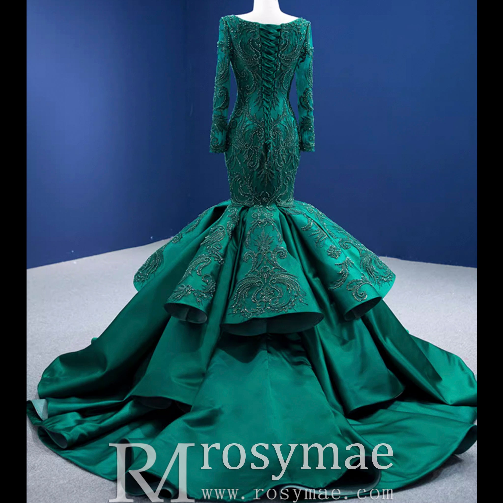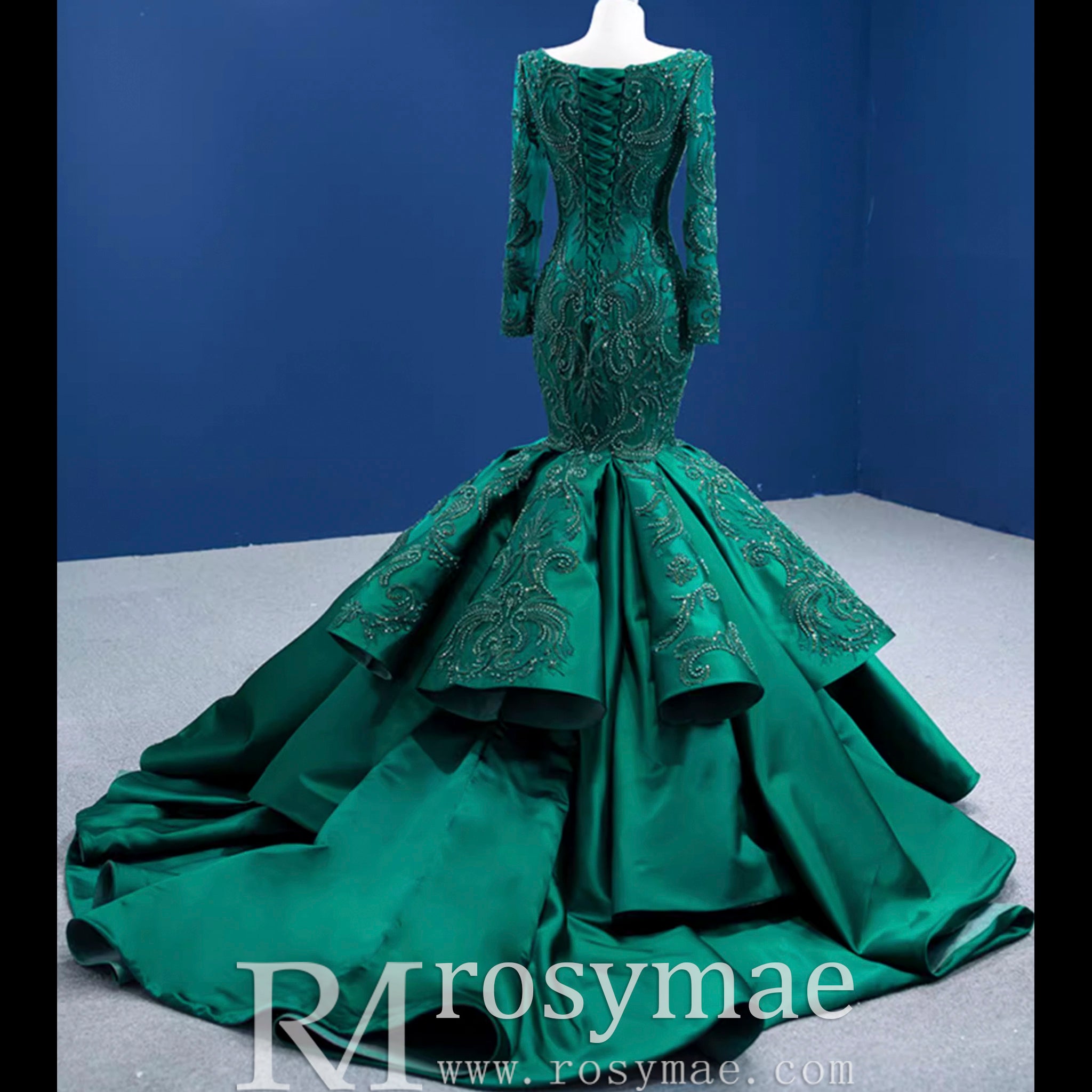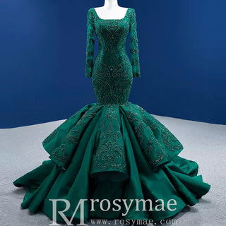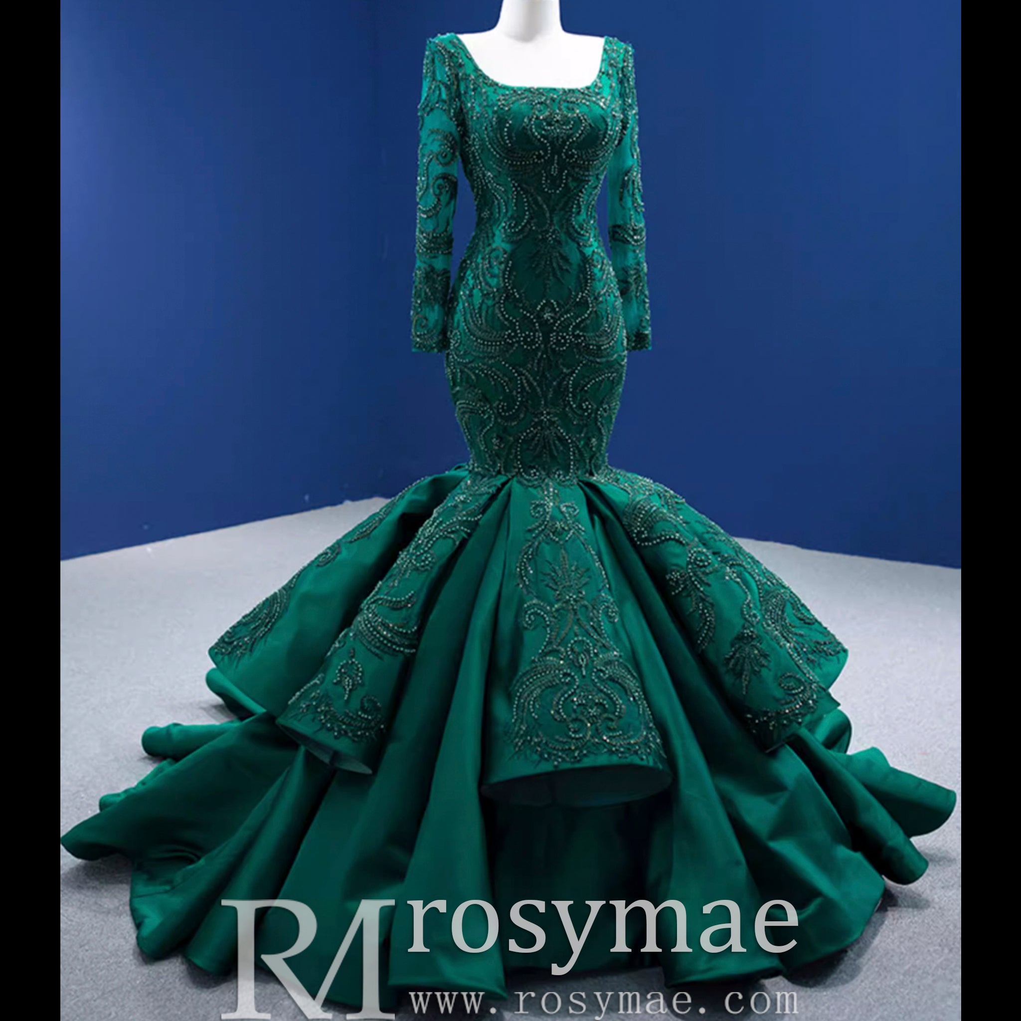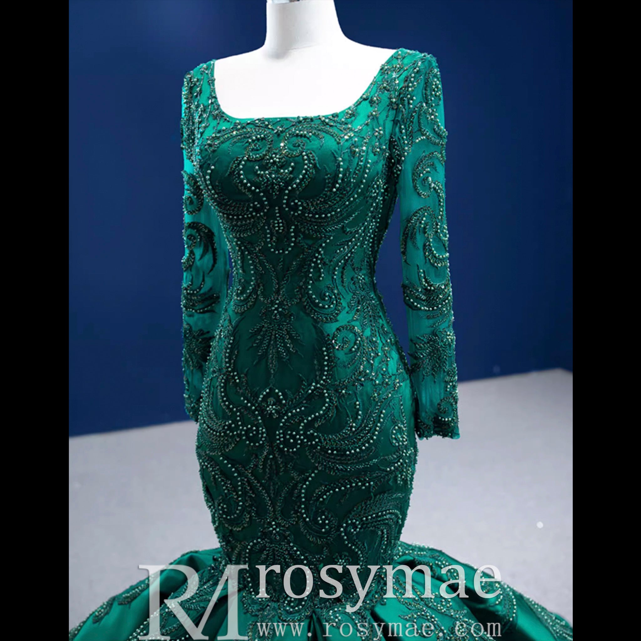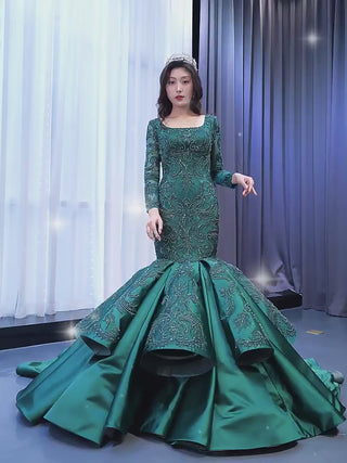 Upgrade your wedding look with this high-end trumpet evening dress or wedding gown. Its long sleeves, square neck, and high back provide a classic and elegant touch. The dress also features a stunning chapel train and eye-catching hunter green color. Make a statement and feel like a true bride with this dress!